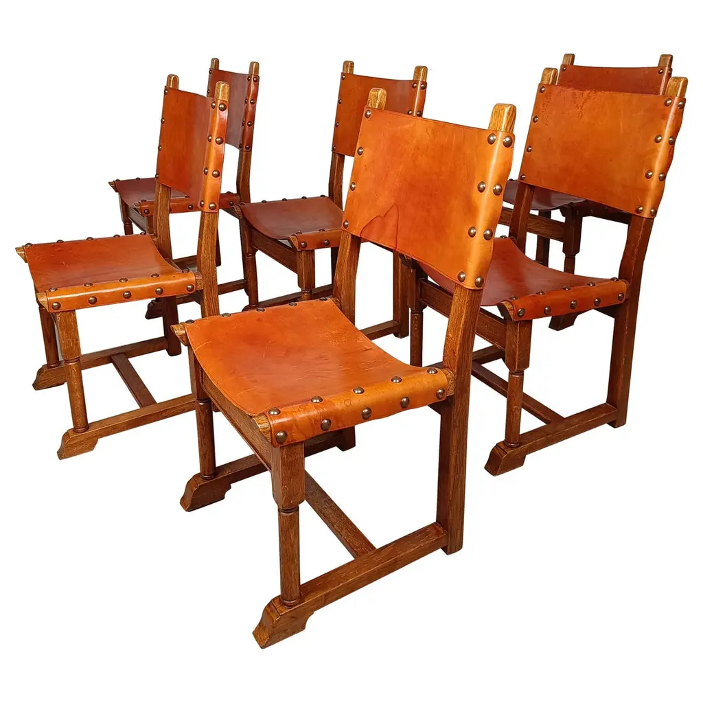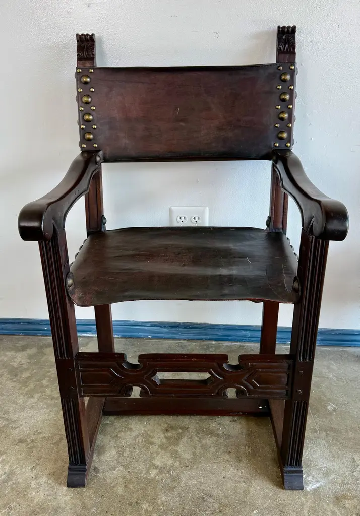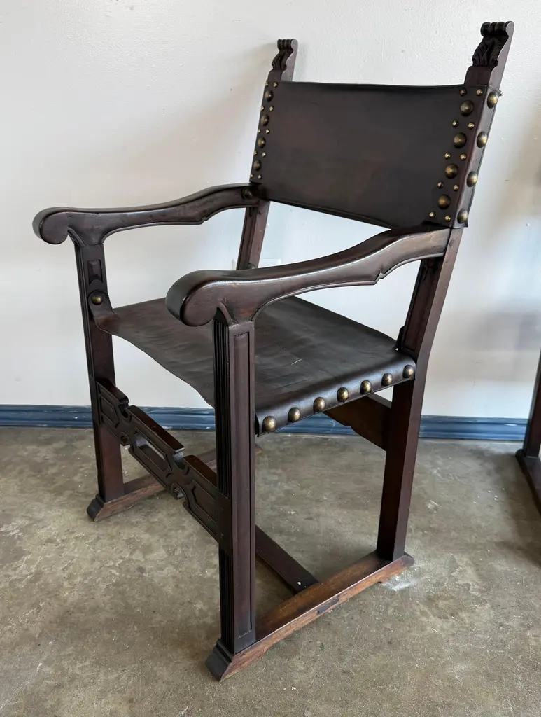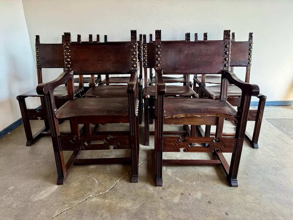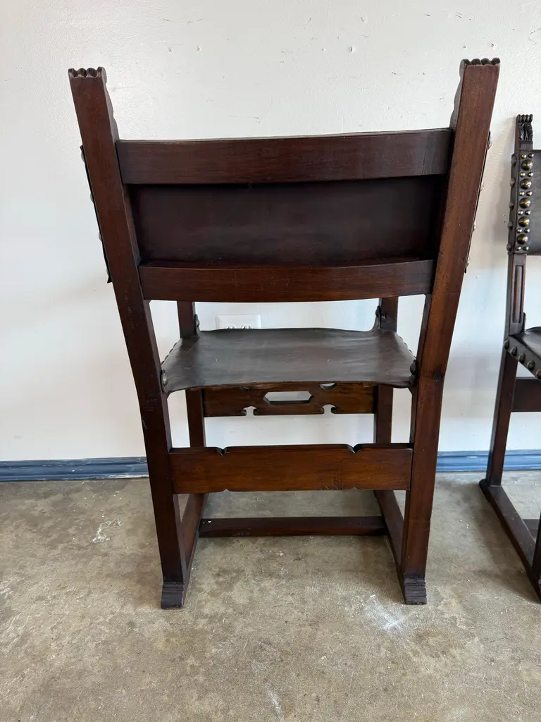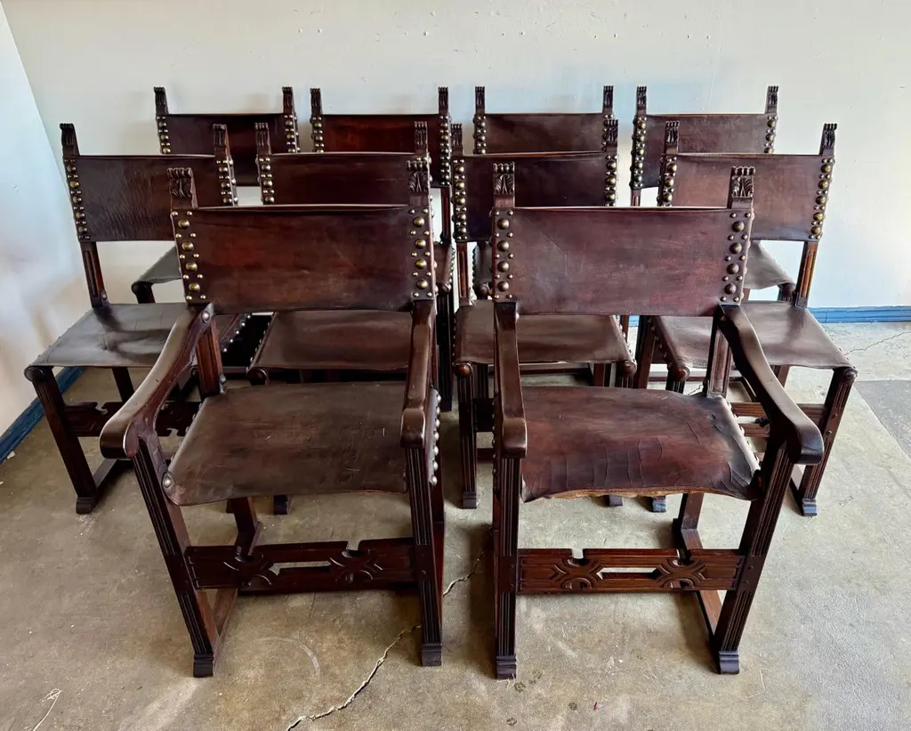 A substantial set of eight Spanish Revival dining chairs, comprised of six side chairs and two armchairs. Each chair features a solid dark-stained hardwood frame with geometric carved stretchers, fluted front legs, and stylized crest finials. The seats and backs are upholstered in original brown leather, accented with oversized brass nailhead trim.The leather shows age and patina consistent with use, with visible wear that enhances the authenticity and character of the set. The armchairs are distinguished by gracefully scrolled arms, adding presence at the head of the table.These chairs reflect the bold Mediterranean aesthetic popular in Spain during the early 20th century, perfectly suited for pairing with a trestle or refectory table. Sturdy and architectural, they make a dramatic statement in dining, library, or hall settings.