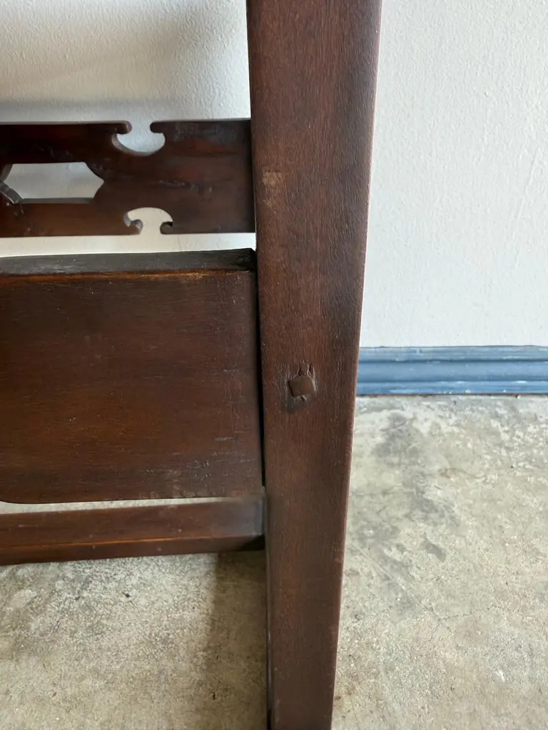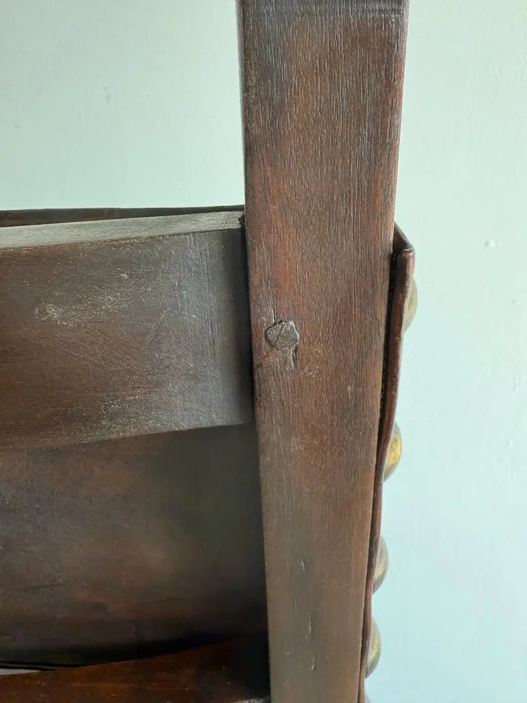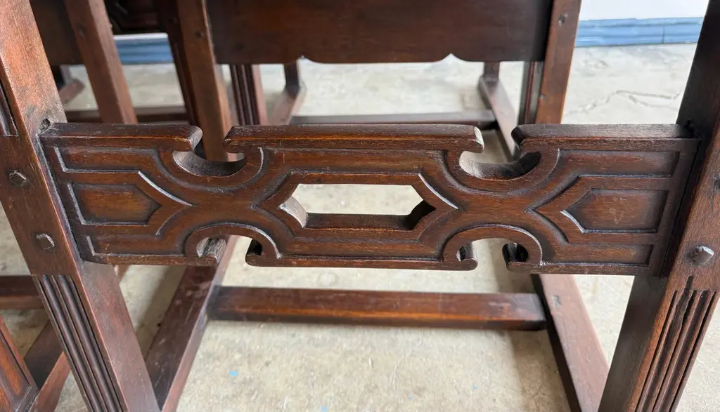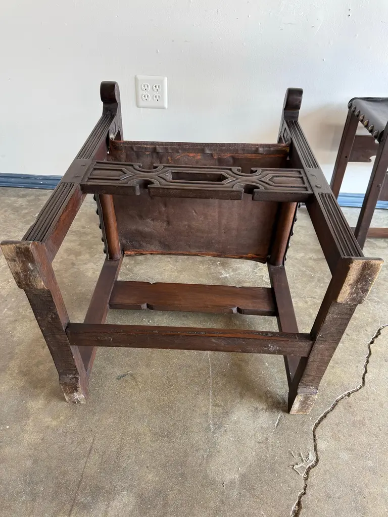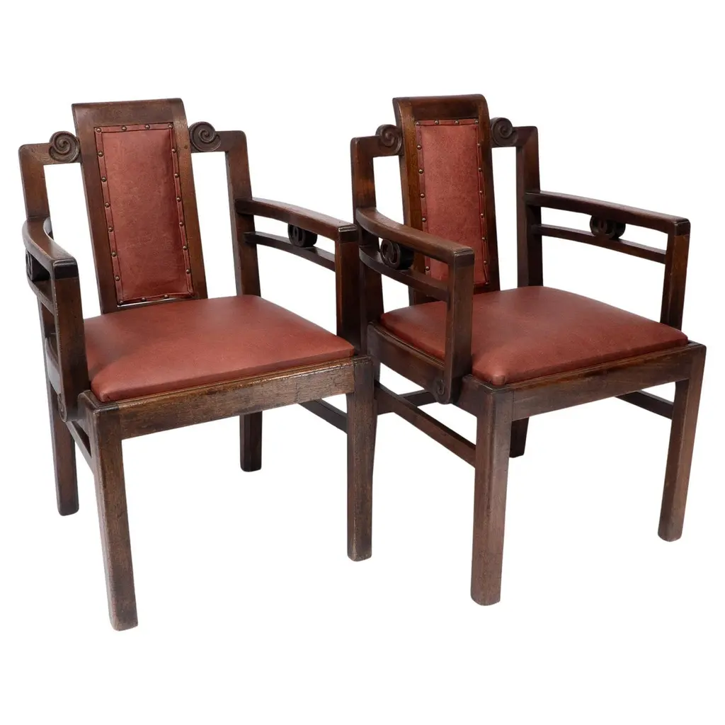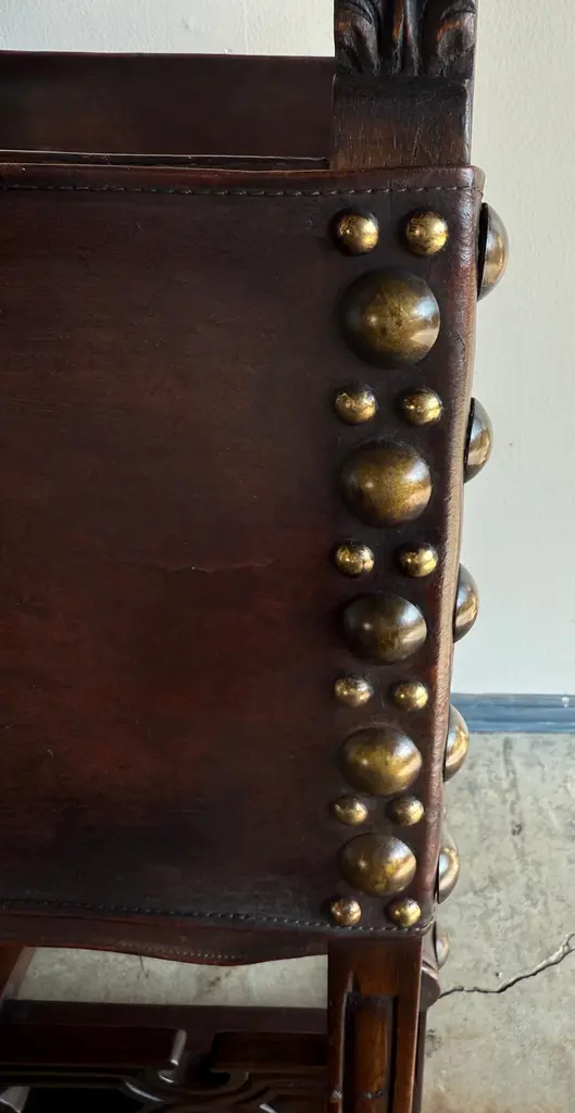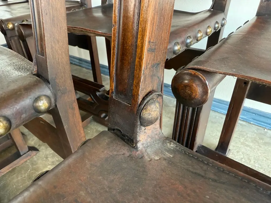 A substantial set of eight Spanish Revival dining chairs, comprised of six side chairs and two armchairs. Each chair features a solid dark-stained hardwood frame with geometric carved stretchers, fluted front legs, and stylized crest finials. The seats and backs are upholstered in original brown leather, accented with oversized brass nailhead trim.The leather shows age and patina consistent with use, with visible wear that enhances the authenticity and character of the set. The armchairs are distinguished by gracefully scrolled arms, adding presence at the head of the table.These chairs reflect the bold Mediterranean aesthetic popular in Spain during the early 20th century, perfectly suited for pairing with a trestle or refectory table. Sturdy and architectural, they make a dramatic statement in dining, library, or hall settings.