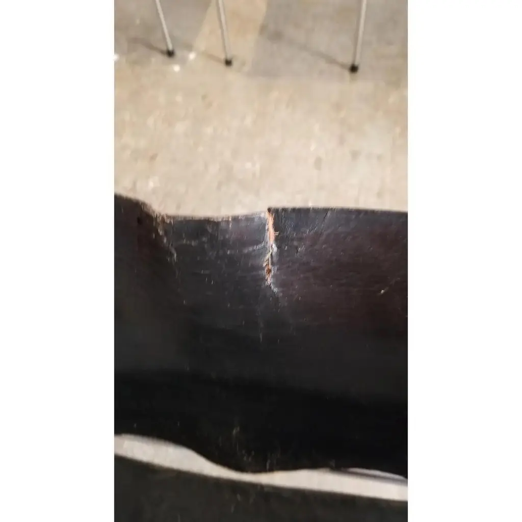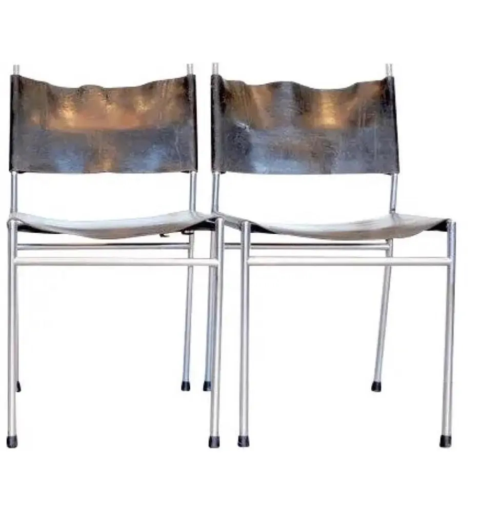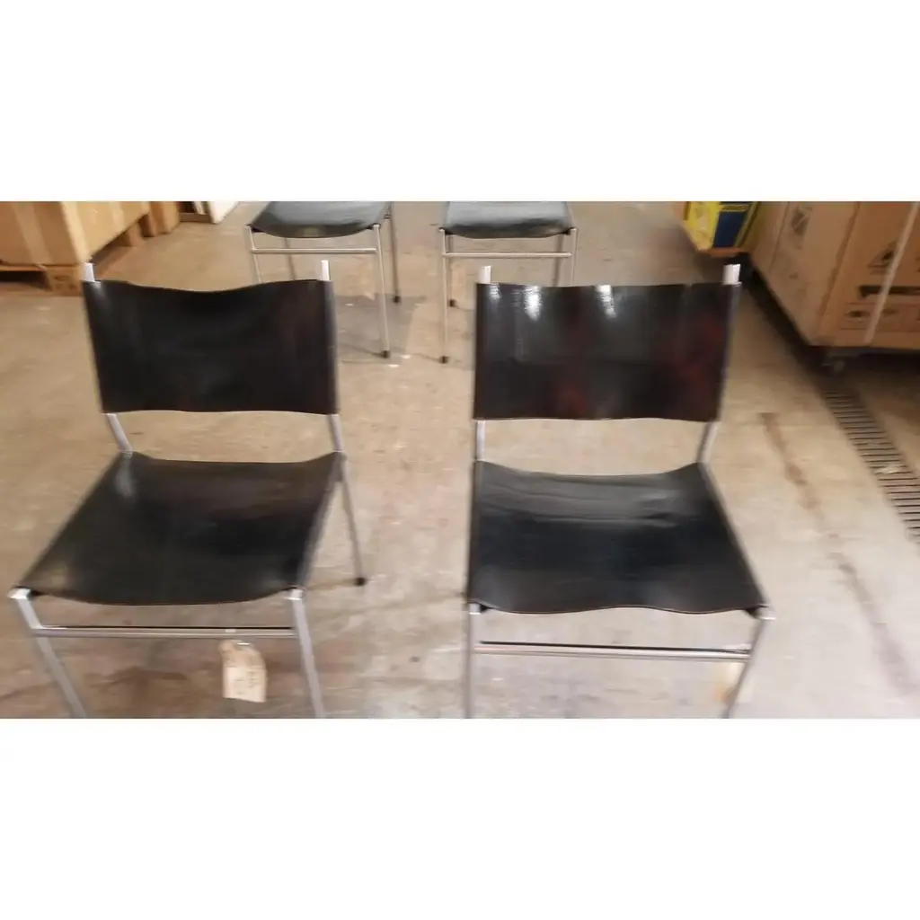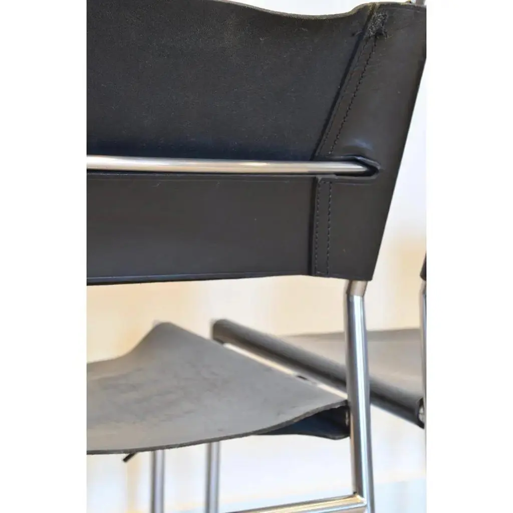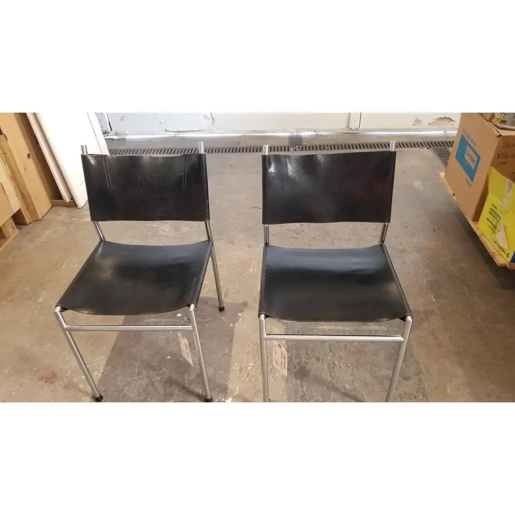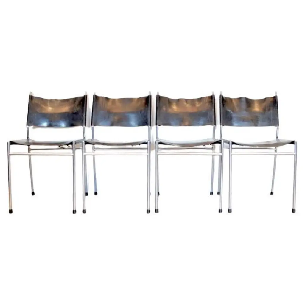 'SE06' style by Martin Visser.Materials: Patinated black leather seat and backs with chrome tubular frames. Approx: 17.5”W x 19.5”D x 30.5”H, seat height: 17.5”H.2 Styles available, additional photos and descriptions available upon request. Character enhanced by patina and wear. Four have black rubber feet and a buckle at the back, the rest have a straight back and straight legs with no rubber feet. SOLD IN SETS OF TWO.