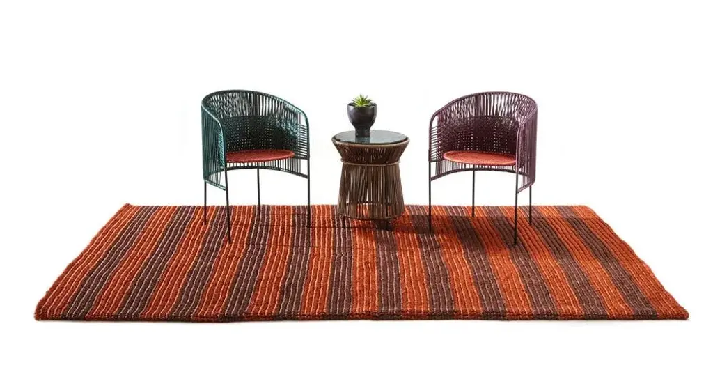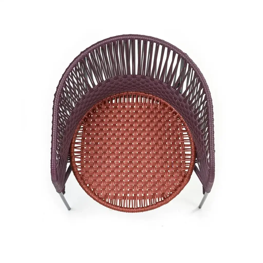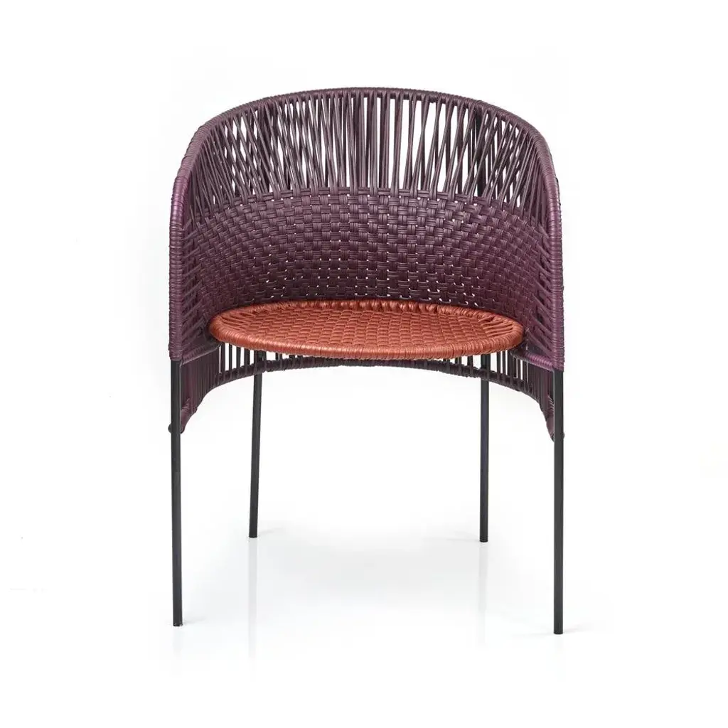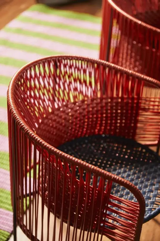 Set of 2 violet orange caribe chic dining chair by sebastian herkner materials: galvanized and powder-coated tubular steel. Pvc strings are made from recycled plastic. Technique: made from recycled plastic and weaved by local craftspeople in colombia. Dimensions: w 55.3 x d 56 x h 75 cm also available colors: blue/ mint/ black, mint/ green/ black, orange/ rose/ curry, green/ rose/ curry. The caribe chic dining chair is an elegant design by sebastian herkner and can be used inside and outdoors. It’s part of our caribe chic collection, featuring an intricate hand-woven webbing in contrasting earthy, muted shades. The pieces and colors are inspired by the incredible nature of the colombian huila region where the serene tatacoa desert meets the powerful rio magdalena. Each armchair is made in santa marta, a city on the caribbean coast of colombia, by local craftspeople. They weave the pvc strings, which are made from recycled plastic, around a powder-coated tubular steel frame. The weaving technique the artesanos and artesanas use are called momposino, a traditional method known for intricate patterns. Just the preparation of all the materials takes ten days, while the production of each armchair takes three days. German designer sebastian herkner is a long-term collaborator of ames and has visited colombia multiple times to experience the country’s cities, nature and people first hand. He also visited many of the ateliers that ames has partnered with to learn about the unique traditional crafts of colombia's regions. A sought-after contemporary designer and recipient of many industry awards, he has worked with many international design brands, creating intriguing pieces that showcase his intuition for interesting material, color, and texture combinations.