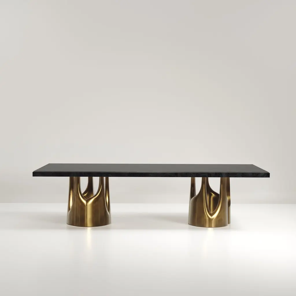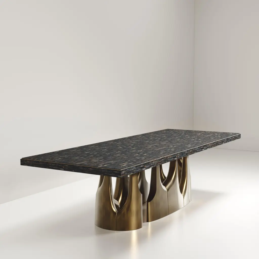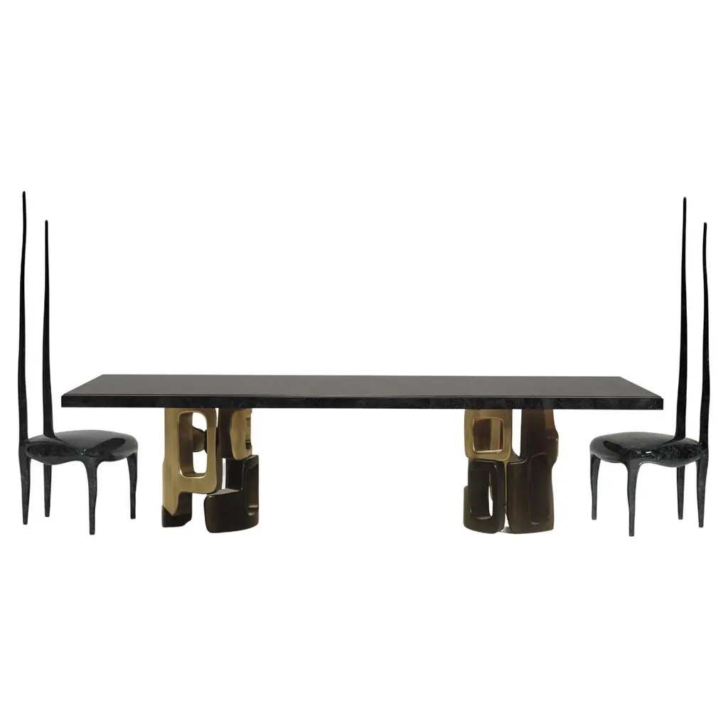 The Paris based label has distinguished themselves since their launch, with their iconic use of shagreen mixed with brass and other exotic materials. All furniture is handcrafted by skilled artisans, ultimately making each piece unique, designed in Paris and produced in the Philippines.The Triptych I dining table by R&Y Augousti is a stunning multi-faceted sculptural piece. The beautiful hand craved details on the bronze-patina base demonstrate the incredible artisan work of Augousti. The top is inlaid in black pen shell. Available in other finishes and other variations This piece is sold with two Sylvie Chairs by R&Y AugoustiThe dimensions of this piece are118.11 x 43.31 x 29.53 inchesAll R&Y Augousti pieces are handmade by artisans, ultimately making each piece unique. Custom color or sizing available on request. Wipe clean with soft dry cloth.Acclaimed design duo Ria & Yiouri Augousti have established themselves since the 1990s as pioneers of modern-vintage style through their luxurious Art Deco inspired collections.The Paris based label has distinguished themselves since their launch, with their iconic use of shagreen mixed with brass and other exotic materials. All furniture is handcrafted by skilled artisans, ultimately making each piece unique. All shagreen-covered items should be kept out of direct sunlight, color variants may occur on the stingray and other exotic finishes, but this showcases the Parisian label's commitment to creating authentic luxurious products using natural components.