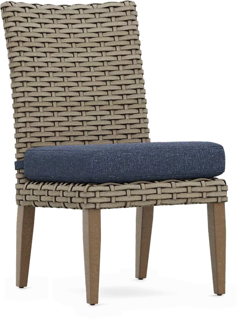 Make mealtime memories on your patio with the Siesta Key dining set. Pairing a 102-inch solid eucalyptus table with all-weather wicker side chairs and a comfortable bench, this group is as durable as it is stylish. An umbrella hole in the center of the table can be capped when not in use. Each side chair features an attractive large weave design and a padded seat cushion in a UV-resistant inky blue color.