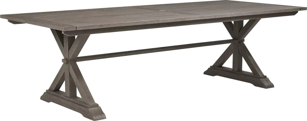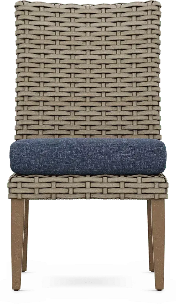 Make mealtime memories on your patio with the Siesta Key dining set. Pairing a 102-inch solid eucalyptus table with all-weather wicker side chairs, this group is as durable as it is stylish. An umbrella hole in the center of the table can be capped when not in use. Each side chair features an attractive large weave design and a padded seat cushion in a UV-resistant inky blue color.