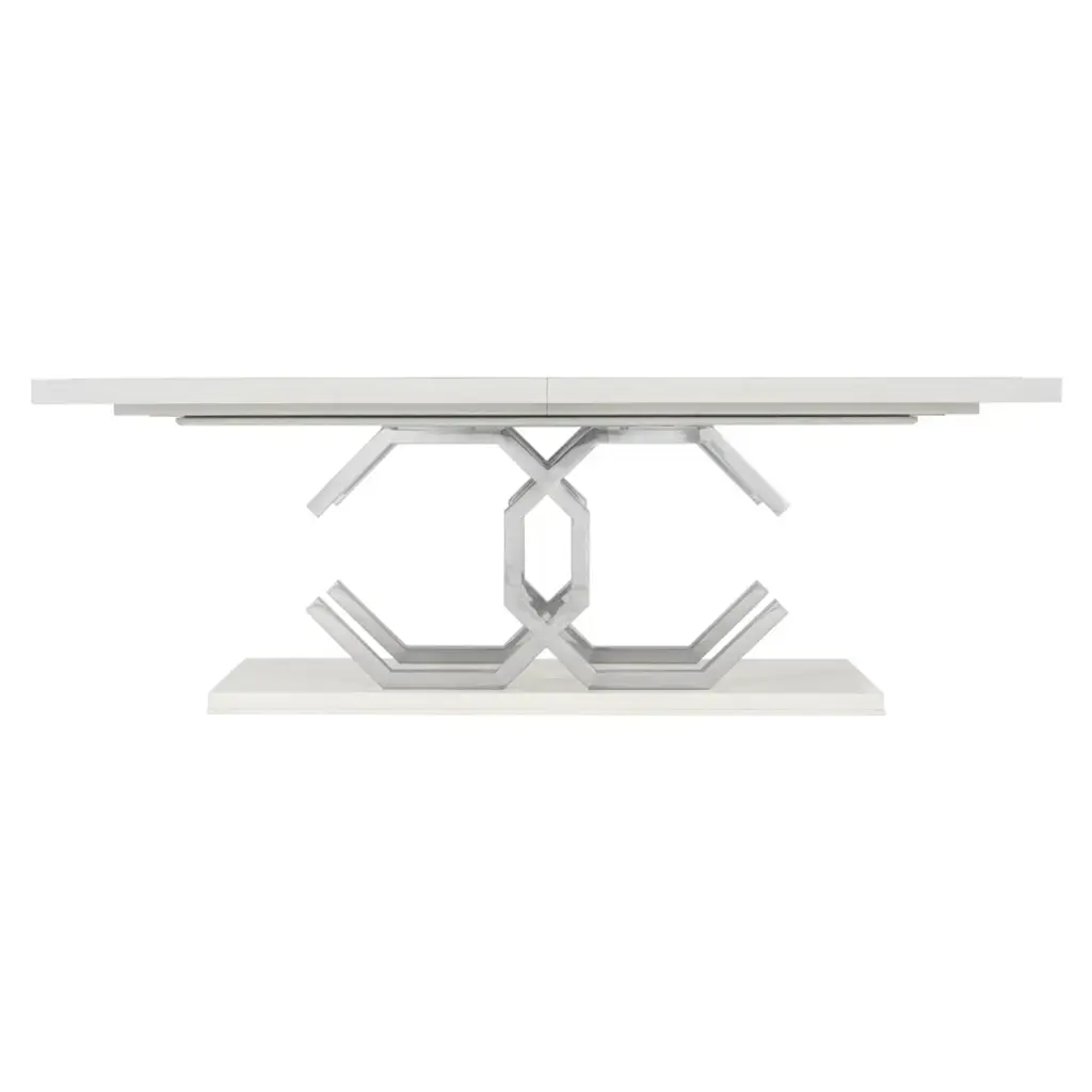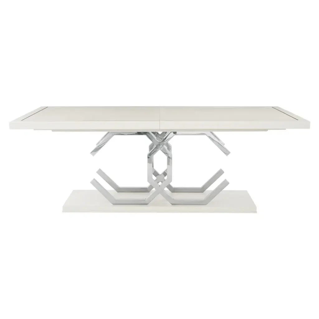 Silhouette is defined by bold contrasts, clean lines, and a hint of Hollywood Regency glamour. The rectangular Silhouette dining table is sculptural and unique. Finished in Eggshell, the fancy face top features a stainless steel inlay border. The two pedestals bring geometric appeal as interlocking open octagons. Throughout the piece, polished stainless steel adds a luxe, mirror-like shine.