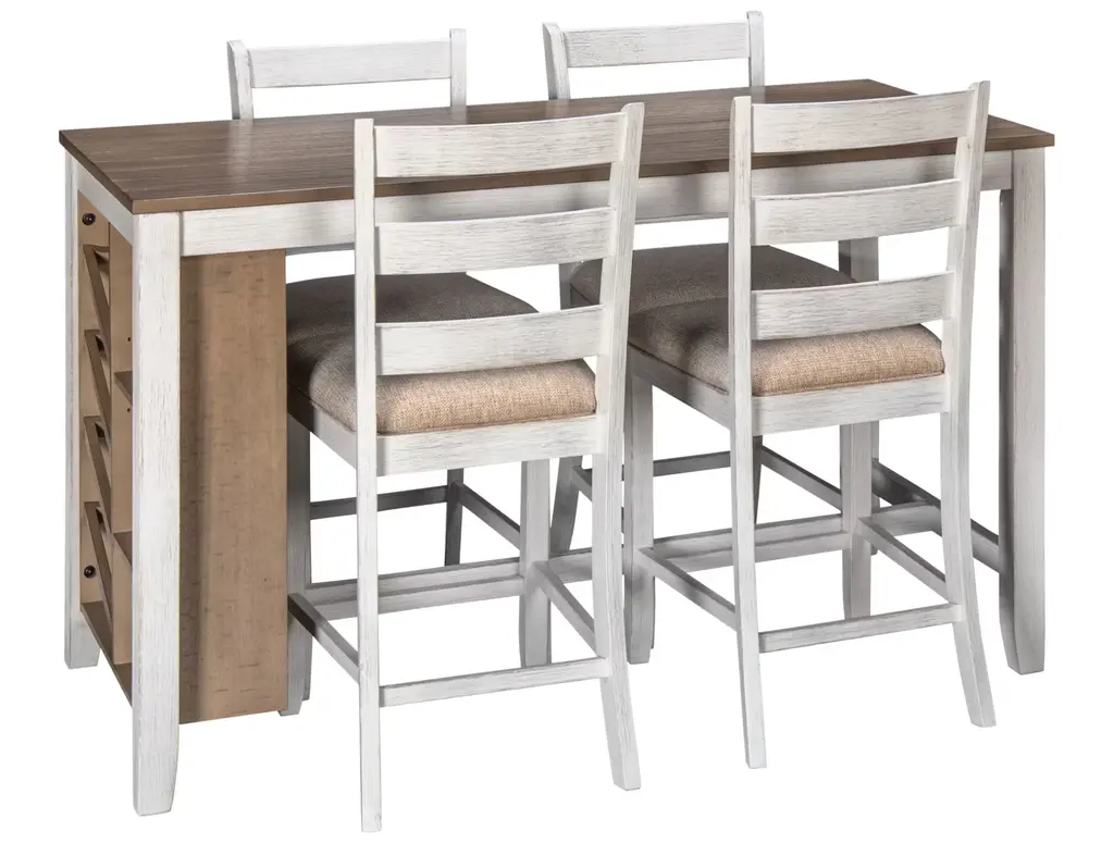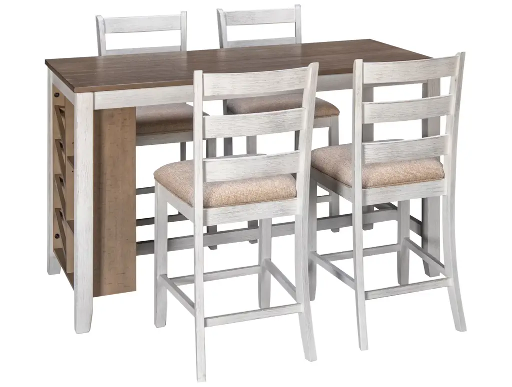 Set the scene for farmhouse living with the Ashley Skempton 5 Piece Dining Set. This space-saving dining set features a two-tone, rectangular counter height table with built-in wine rack, and shelves for cookbooks or display items. Four upholstered ladderback stools complete the look of this country-style set that's perfect for a dining room or game room.