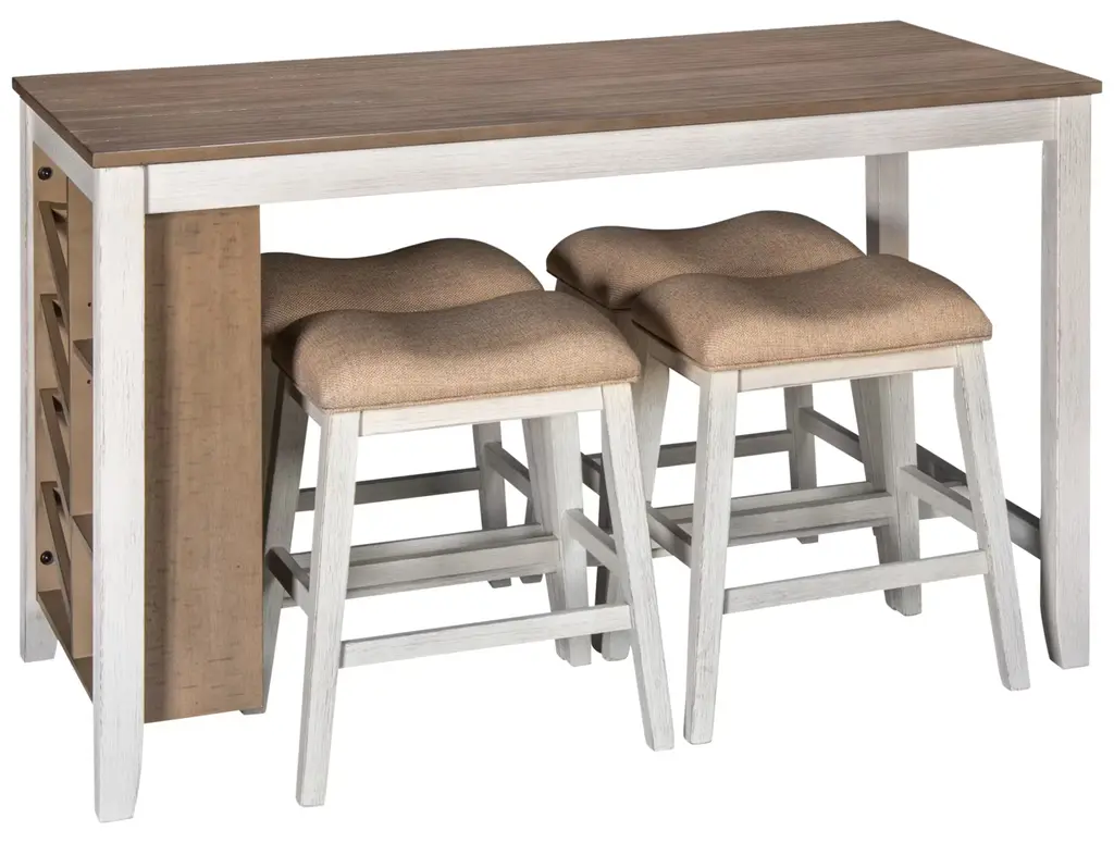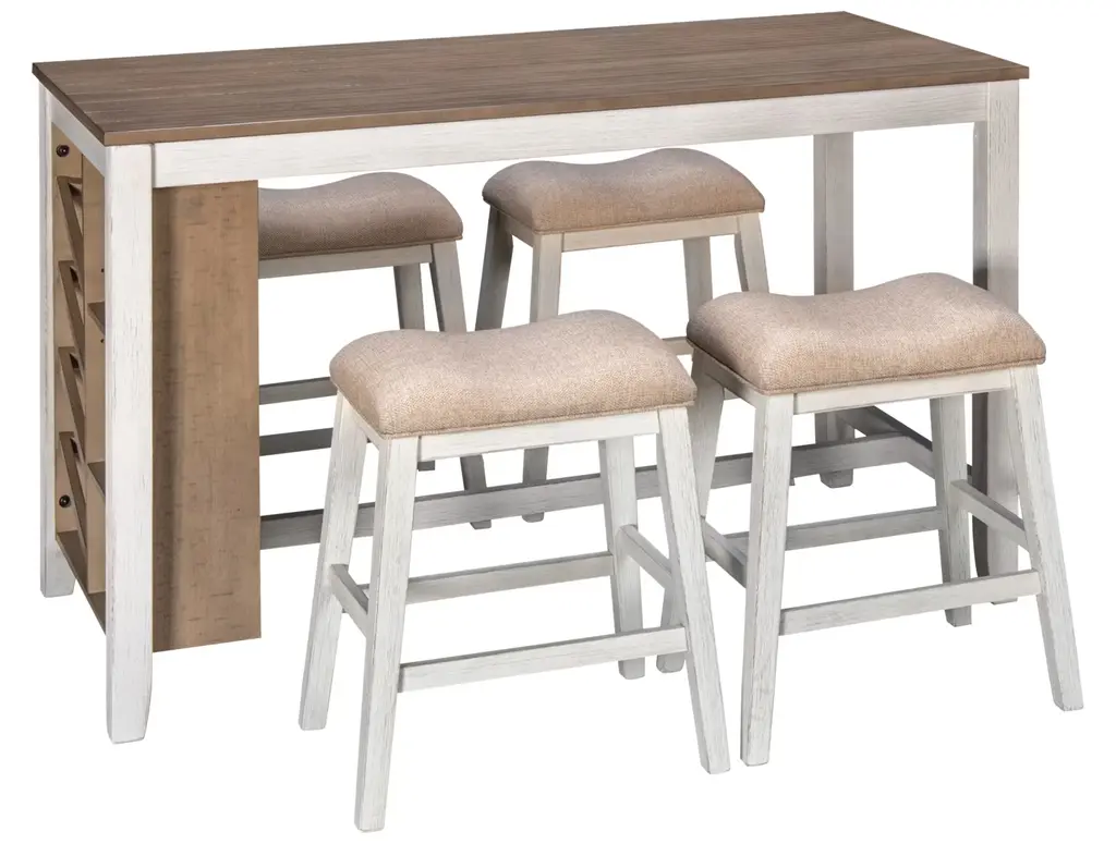 Set the scene for farmhouse living with the Ashley Skempton 5 Piece Dining Set. This space-saving dining set features a two-tone, rectangular counter height table with built-in wine rack, and shelves for cookbooks or display items. Four upholstered backless stools complete the look of this country-style set that's perfect for a dining room or game room.