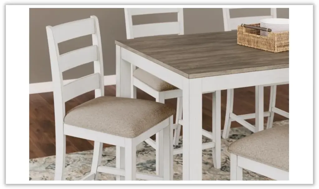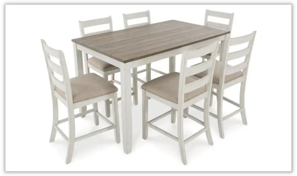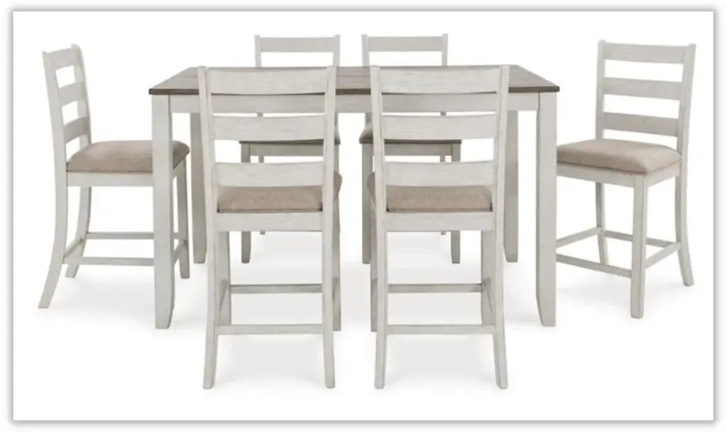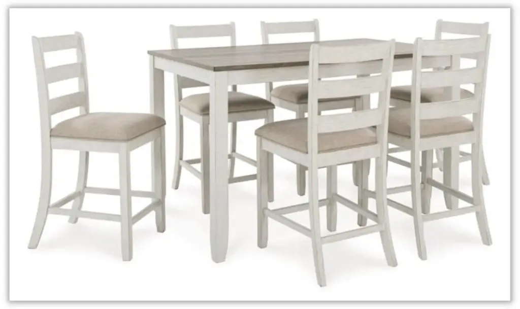 Transform your dining space with the Skempton 7-Piece Counter Height Dining Room Set, a perfect blend of coastal chic and modern farmhouse aesthetics. The table features a clean-lined design with a brown plank effect top, creating a charming contrast with the grayish-white base that boasts a tasteful rub-through effect for a timeworn allure. Crafted with precision from hardwood solids, acacia veneer, and MDF substrate, the table exudes durability and style. This set includes six counter-height bar stools that embrace classic ladderback styling and come with comfortably upholstered seats in polyester fabric. The grayish-white finish with a rub-through effect on the stools complements the brown wood-tone finish on the table, creating a harmonious and inviting atmosphere. The solid wood frames ensure the stools' sturdiness, while foam-cushioned seats provide a comfortable dining experience. Assembly is required for this thoughtfully curated dining set, allowing you to effortlessly create a welcoming and stylish space for family and friends to gather. Redefine your dining experience with the Skempton 7-Piece Counter Height Dining Room Set, where quality craftsmanship meets timeless design.Note:7 Pieces Include: Counter Height Dining Table + 6 Bar Stools