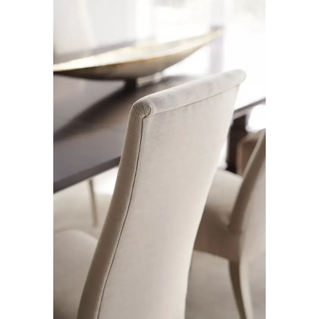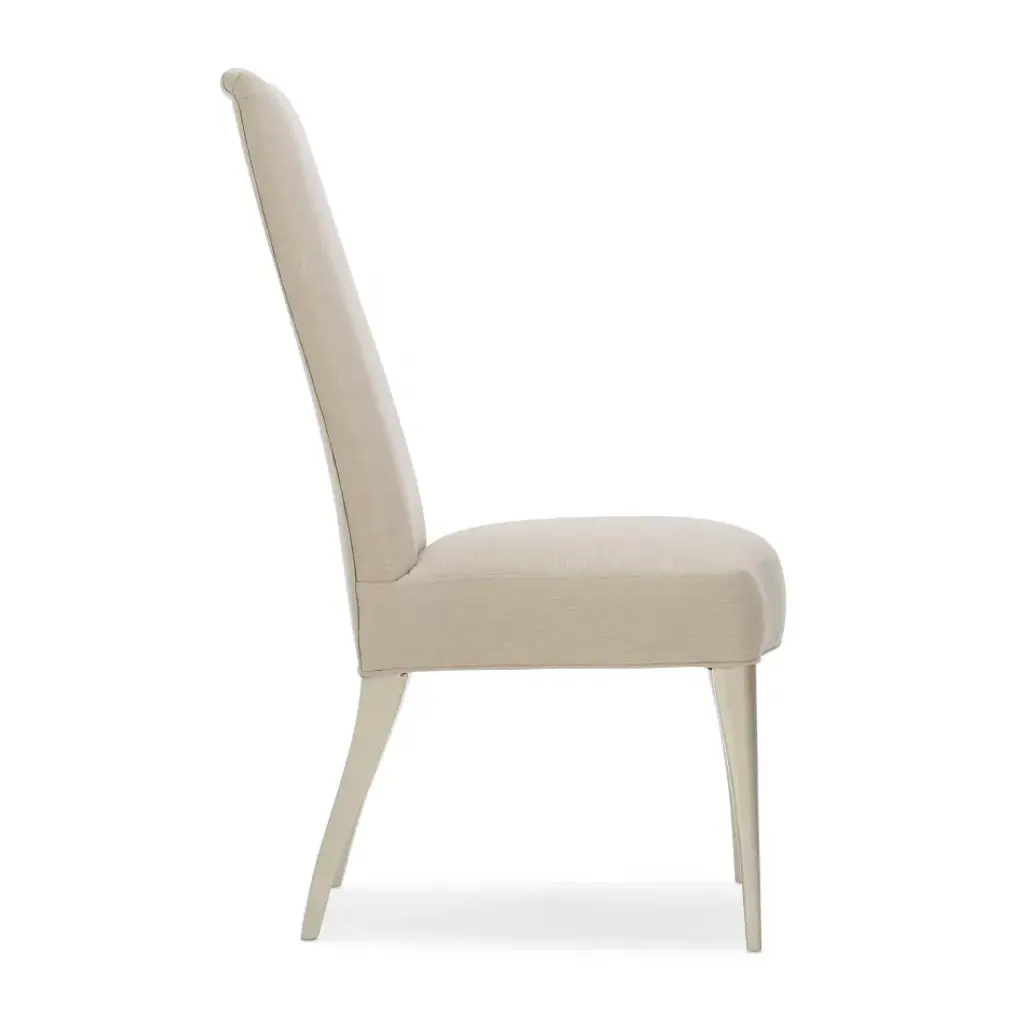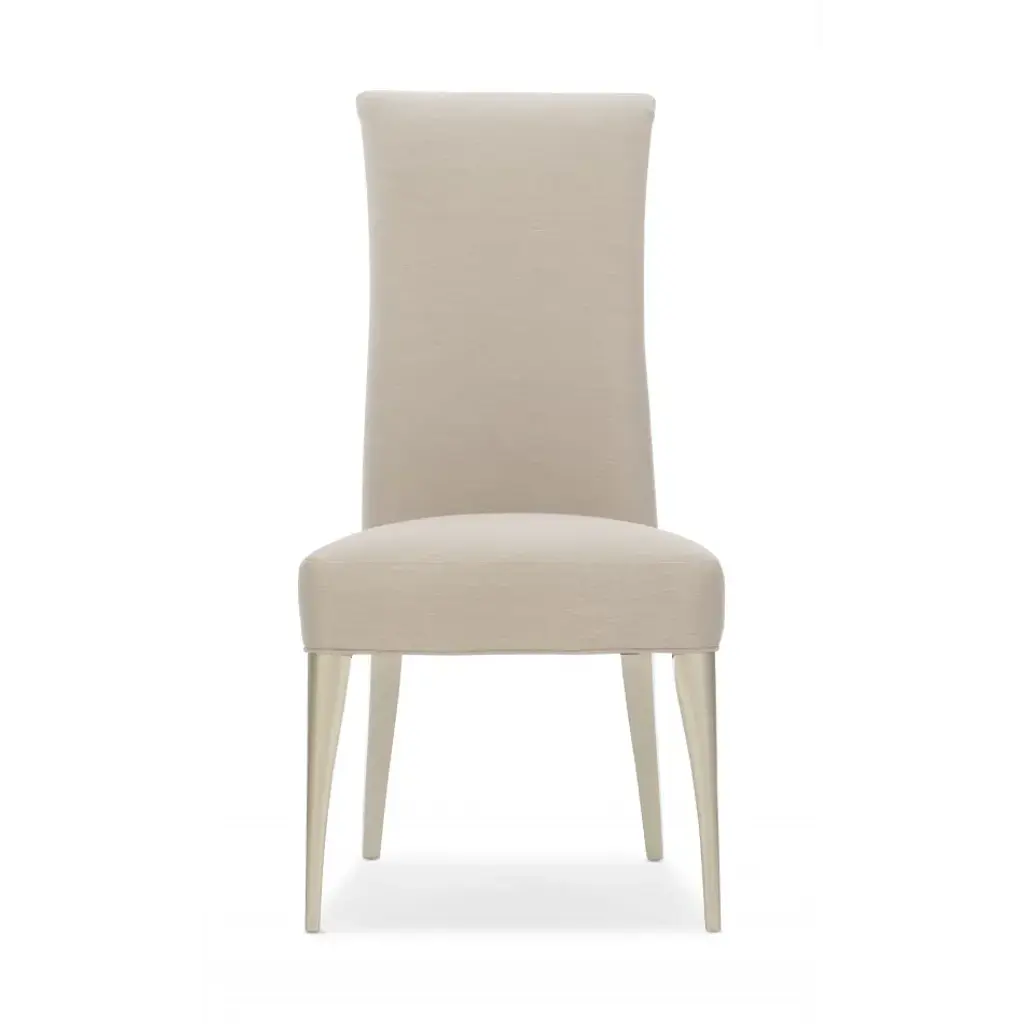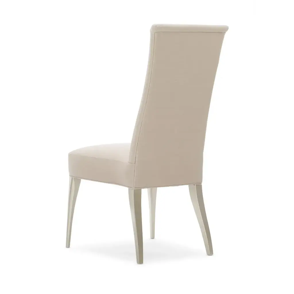 A true standout, the look of this bold dining chair will enchant everyone who sees it. Drawing inspiration from classic forms it features a tall, stately seat back that adds height and presence to any dining space. Fully upholstered and tailored to perfection, it also features tapered legs finished in a chic shade of Soft Silver Paint. This posh dining chair represents the perfect balance of style and substance.