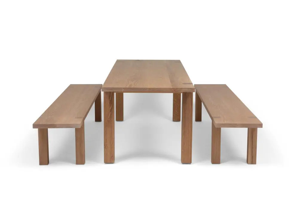 Our table and bench set has been designed in our studio in Los Angeles over a spring time of 2021, which we spent inside with windows wide open, daydreaming of that farm stay vacation we were all longing for. Our pieces, including this set, are fully fabricated just a few miles away from our studio, in Los Angeles. Made with solid, rustic white oak, we apply a hand finish (wax oil, 0 VOC) on all our solid wood pieces in Klein Home Collection, giving the table and benches a supple and soft feel. The set is sold as a complete set (table + two benches) as well as individual items. Kindly reach out to discuss your preferred combination. We are happy to modify dimensions as well as finish and wood species if preferred.