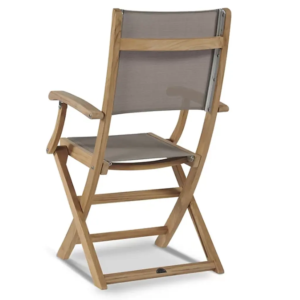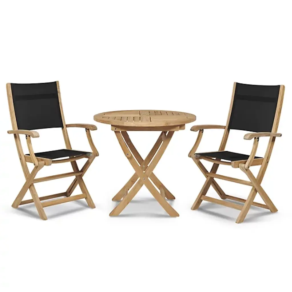 The Stella 3-Piece Outdoor Dining Set with Armchairs from HiTeak Furniture addresses the specific needs of narrow balconies and garden corners where larger dining sets would overwhelm the available space. One Valencia Folding Table pairs with two Stella Armchairs to create an intimate dining experience for breakfast or casual meals outdoors. The table includes an umbrella hole for shade during hot summer days, while both table and chairs fold for convenient storage when not needed. Durable sling construction on the chair seats and backs provides contemporary styling that complements the practical folding design.