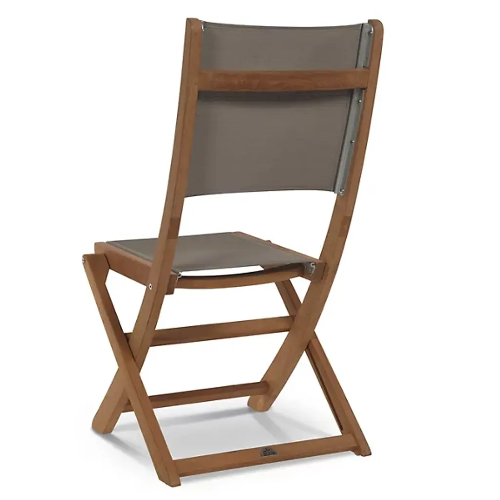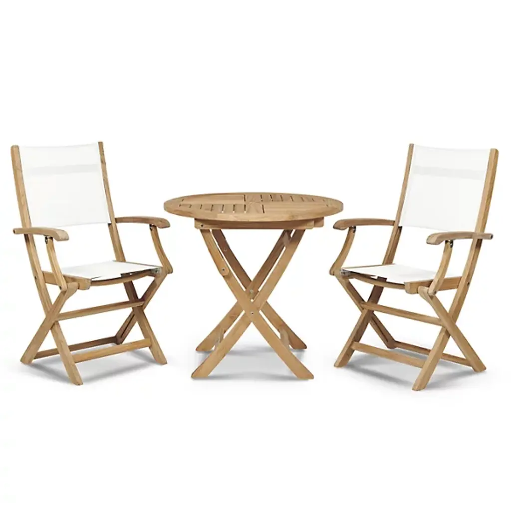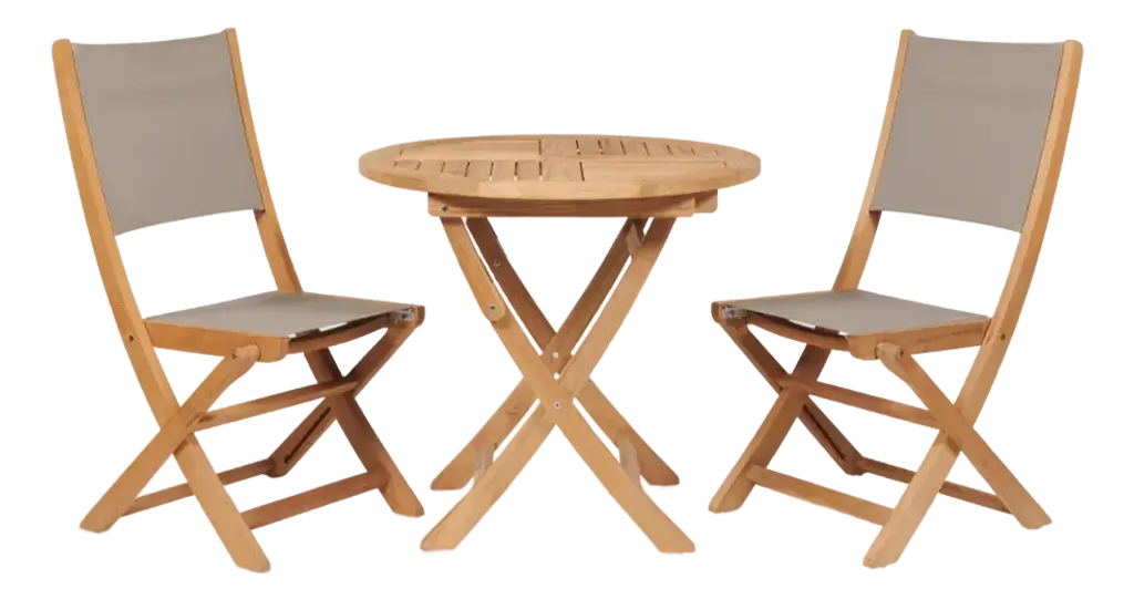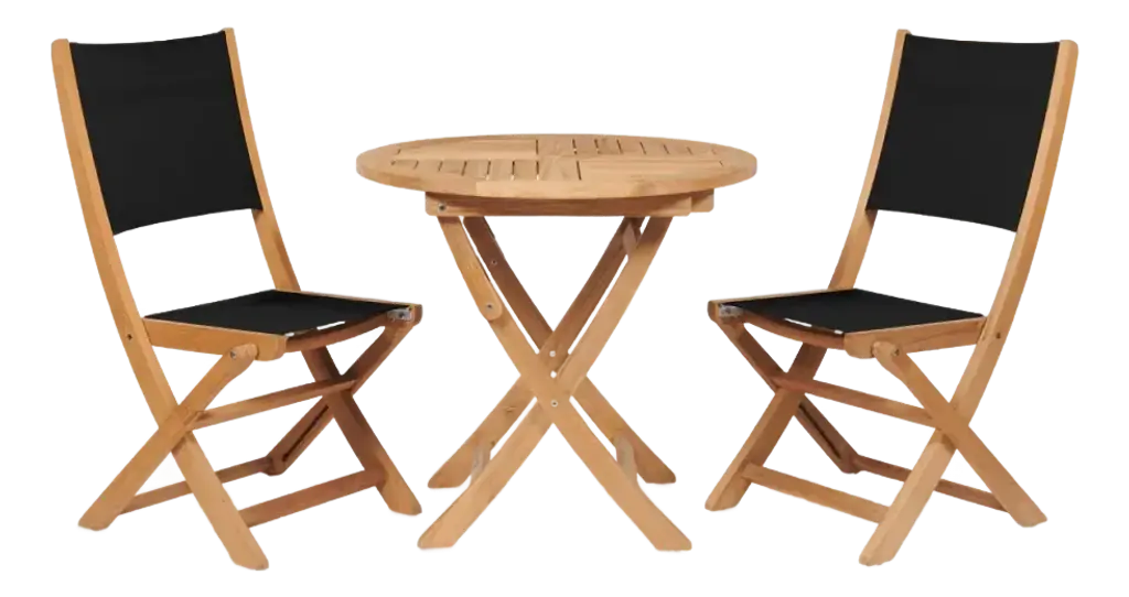The Stella 3-Piece Outdoor Dining Set with Sidechairs from HiTeak Furniture creates an intimate dining experience designed specifically for narrow balconies and garden corners. One Valencia Folding Table pairs with two Stella Side Chairs to establish a cozy breakfast spot that maximizes functionality within minimal square footage. The table incorporates an umbrella hole that provides shade options during the intense summer heat, while durable sling construction on both seat and back surfaces delivers contemporary styling alongside lasting comfort. All pieces fold completely flat for storage, making this set ideal for seasonal use or spaces that serve multiple purposes.