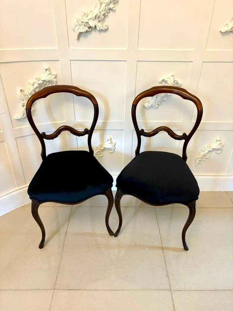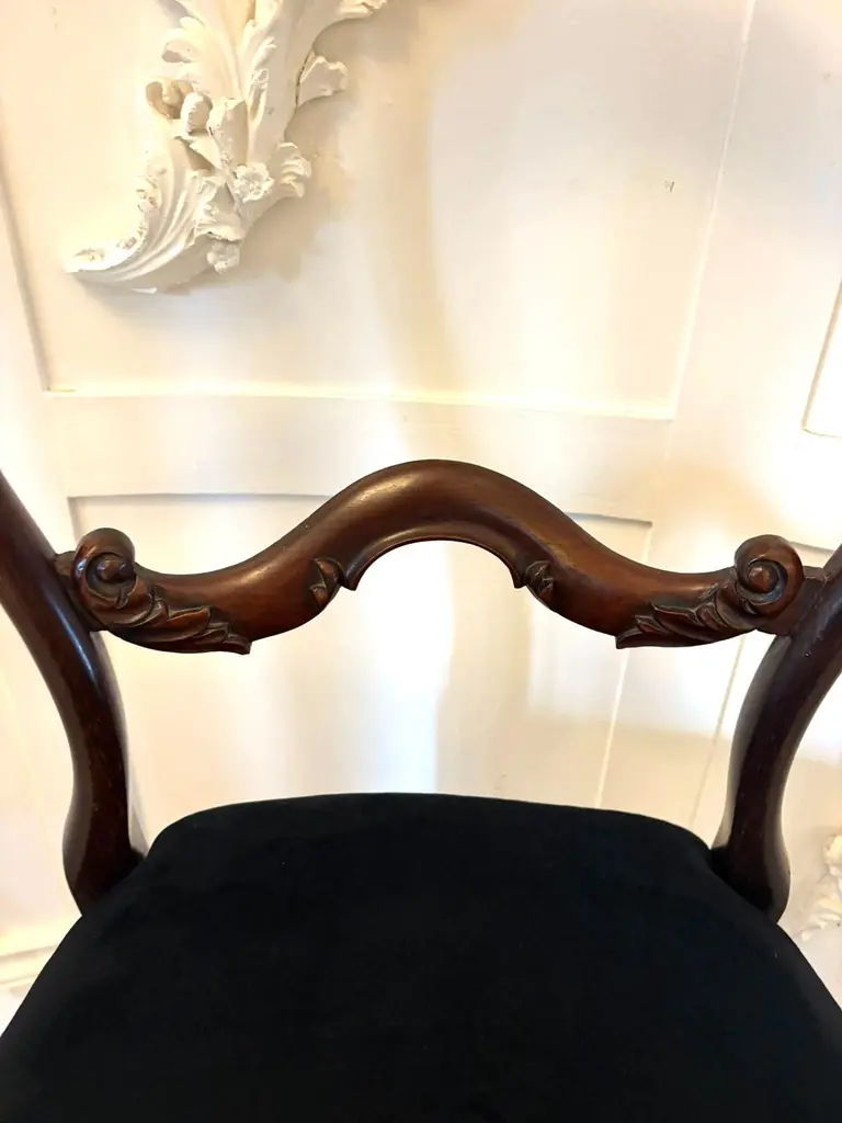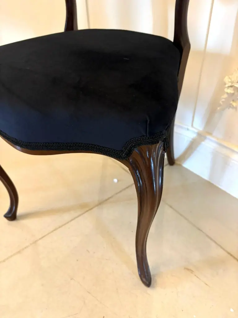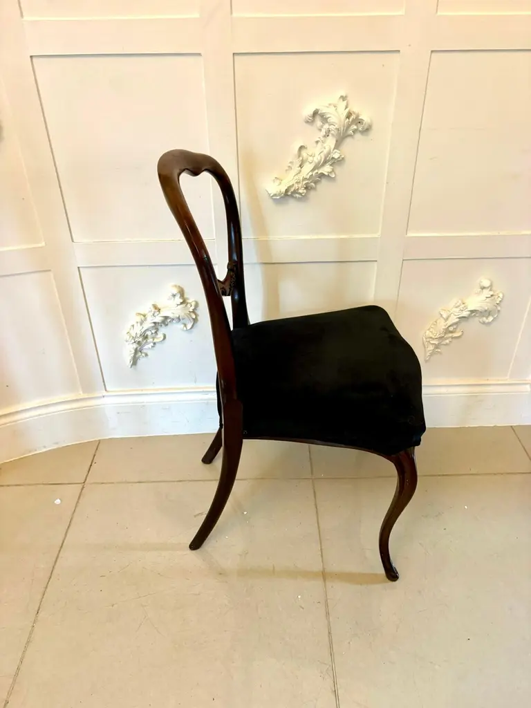 Superb quality set of ten antique Victorian rosewood dining chairs having a magnificent quality shaped rosewood back and centre splat, newly reupholstered serpentine shaped seats in a quality black velvet fabric standing on shaped cabriole legs to the front and outswept back legs.An elegant set all being sturdy and structurally sound and boasting a wonderful colour.We provide dealer shipping and ensure that your piece is well handled, packed, and transported, and provided with all of the necessary paperwork. We research every antique we sell to ensure compliance with international shipping regulations. The period pieces we sell were mostly crafted from materials that are not included in the restricted species that are currently limited by CITES regulations per appendix II.Dimensions:Height 84.5 cm (33.27 in)Width 46 cm (18.11 in)Depth 43 cm (16.93 in)Seat height 44 cm (17.32 in)Dated 1850