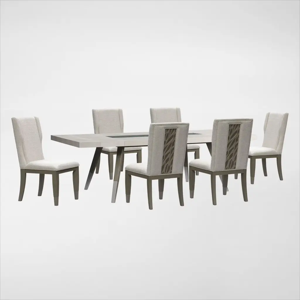 Designed with a sculptural appeal, the Tahoe Rectangular Dining Table and 4 Upholstered Side Chairs feature soft curves, thick legs and cozy upholstery for a look you'll love year after year.