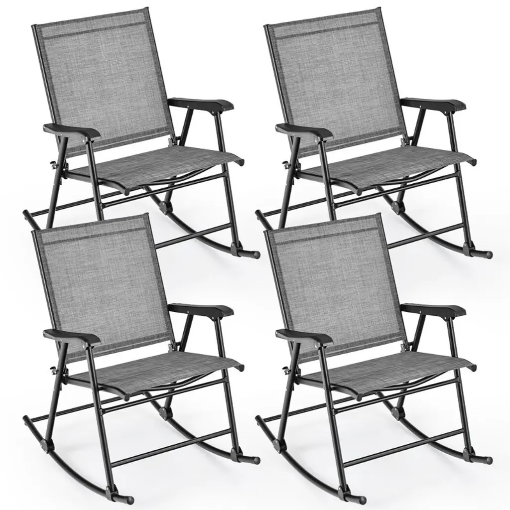 This 4-piece patio chair set is made of breathable fabric and a heavy-duty metal frame, weatherproof and fade-resistant, withstanding many years of use. Its folding design makes it easy to store and carry, ideal for outdoor use. High backrests, wide seats, and smooth armrests are ergonomically designed to provide you with a comfortable sitting experience. This patio metal chair set can be matched with various tables, perfect for placing in your garden, backyard, balcony, poolside, dining room, etc., allowing you to enjoy leisure time with your family or friends.FeaturesHeavy duty and rustproof metal frame for stability and durability Superior fabric for backrest and seat, breathable and skin-friendly Comfortable high backrest and wide seat for a better sitting experienceSpecifications:Color: Black and Gray Material: Metal, Fabric Unfolding Dimension of Each Chair: 23" x 24" x 38" (W x D x H) Folding Dimension of Each Chair: 23" x 2" x 35" (W x D x H) Seat Height from the Ground: 17" Net Weight of Each Chair: 9 lbs Weight Capacity of Each Chair: 330 lbs Package Includes: 4 x Chairs 1 x Instruction