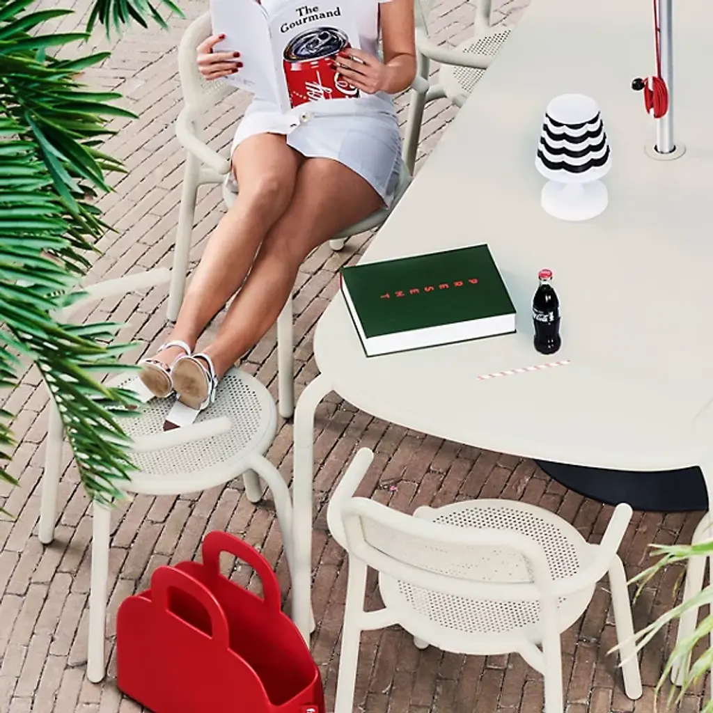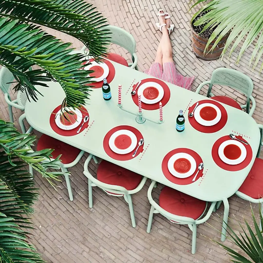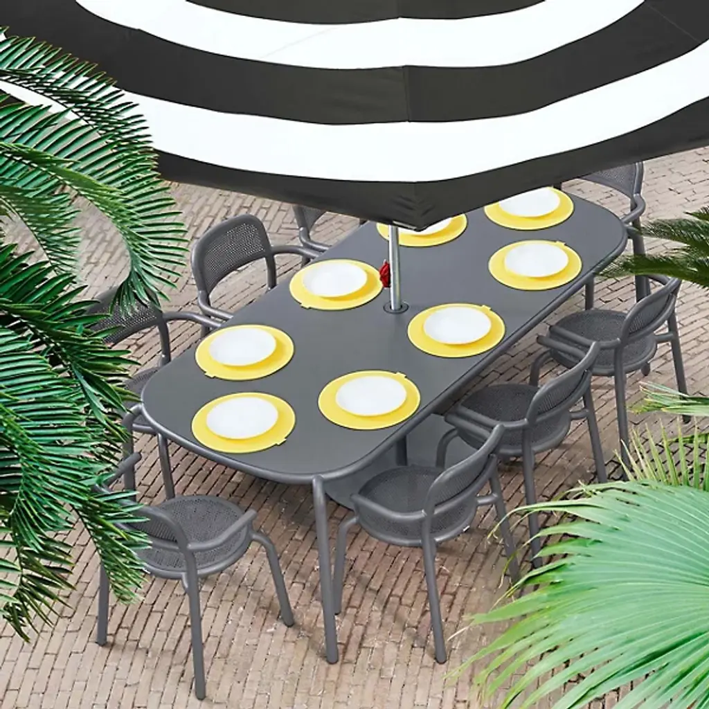 The Toni Tablo Outdoor Dining Table Set with 6 Armchairs from Fatboy provides a perfect addition to patio or outside spaces. Designed by Erik Stehmann, this contemporary set features a bold design with basic materials. It includes a grand table made from lightweight, UV-resistant, all-weather aluminum accompanied by stackable chairs with swooping arms and pierced backs to avoid pooling water. An umbrella holder doubles as a candle holder, keeping away rain, sun, darkness, or mosquitos with equal ease. The set combines functionality with stylish appeal and is great for indoor and outdoor use