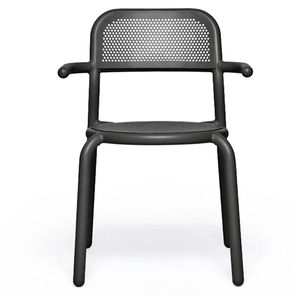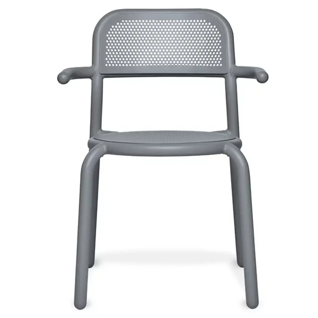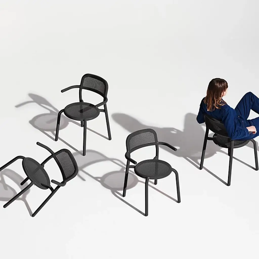 The Toni Tablo Outdoor Dining Table Set with 6 Armchairs from Fatboy provides a perfect addition to patio or outside spaces. Designed by Erik Stehmann, this contemporary set features a bold design with basic materials. It includes a grand table made from lightweight, UV-resistant, all-weather aluminum accompanied by stackable chairs with swooping arms and pierced backs to avoid pooling water. An umbrella holder doubles as a candle holder, keeping away rain, sun, darkness, or mosquitos with equal ease. The set combines functionality with stylish appeal and is great for indoor and outdoor use