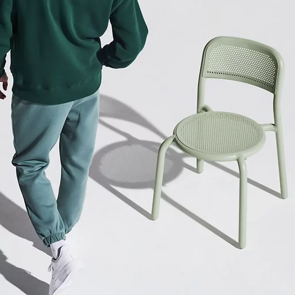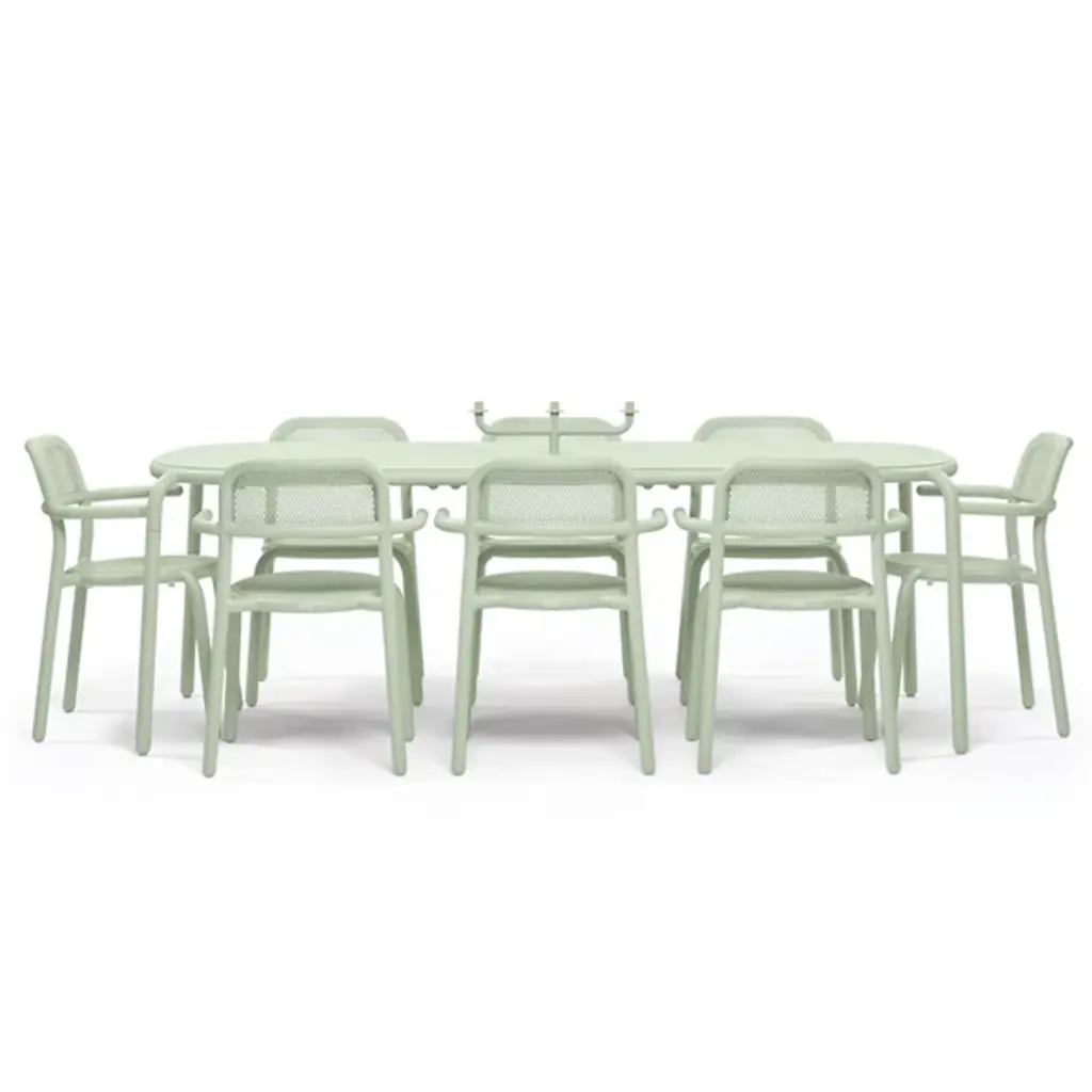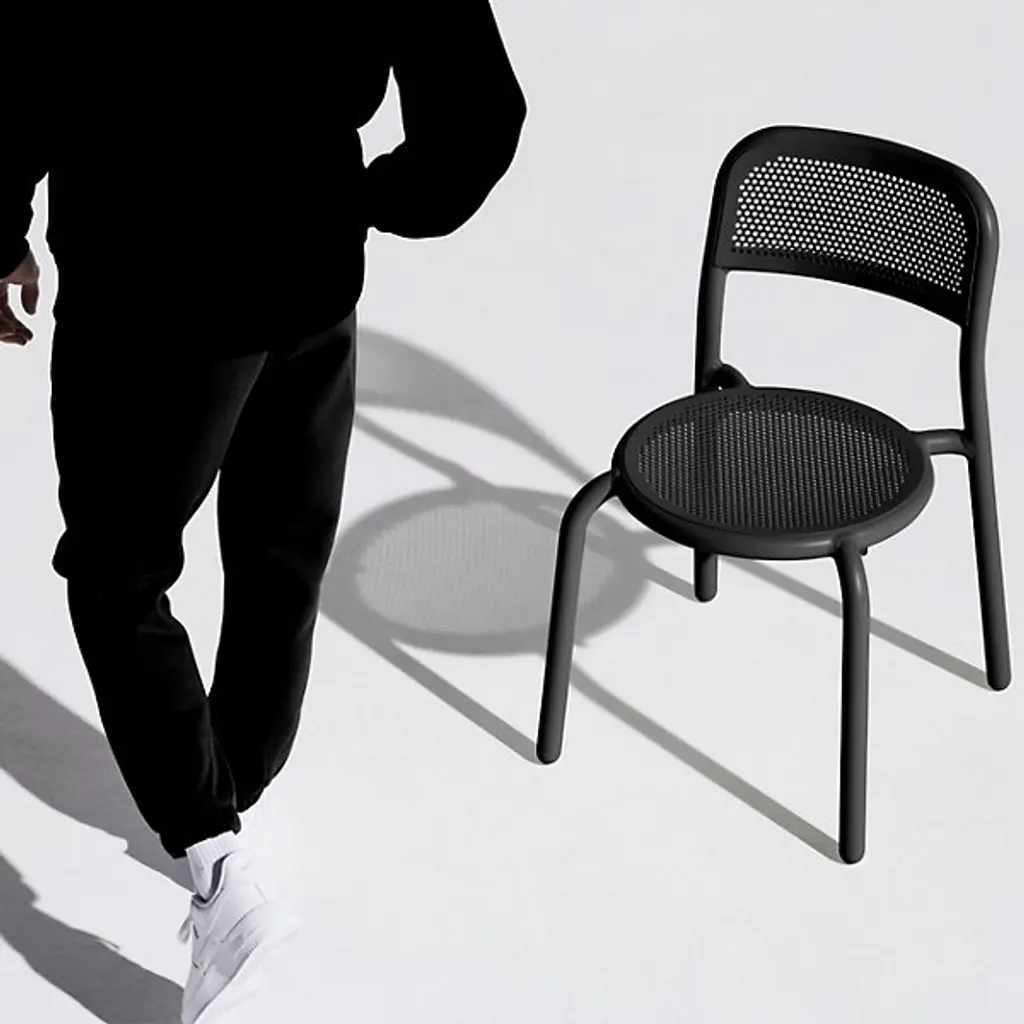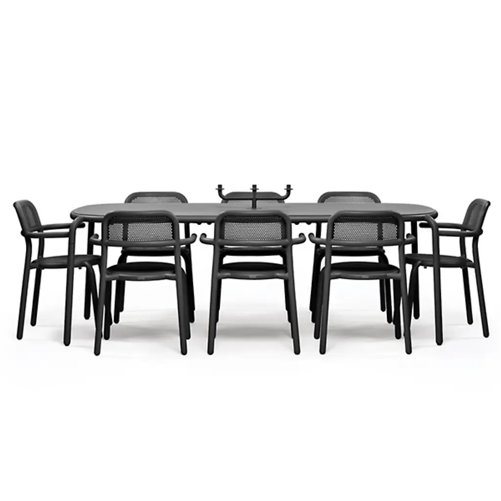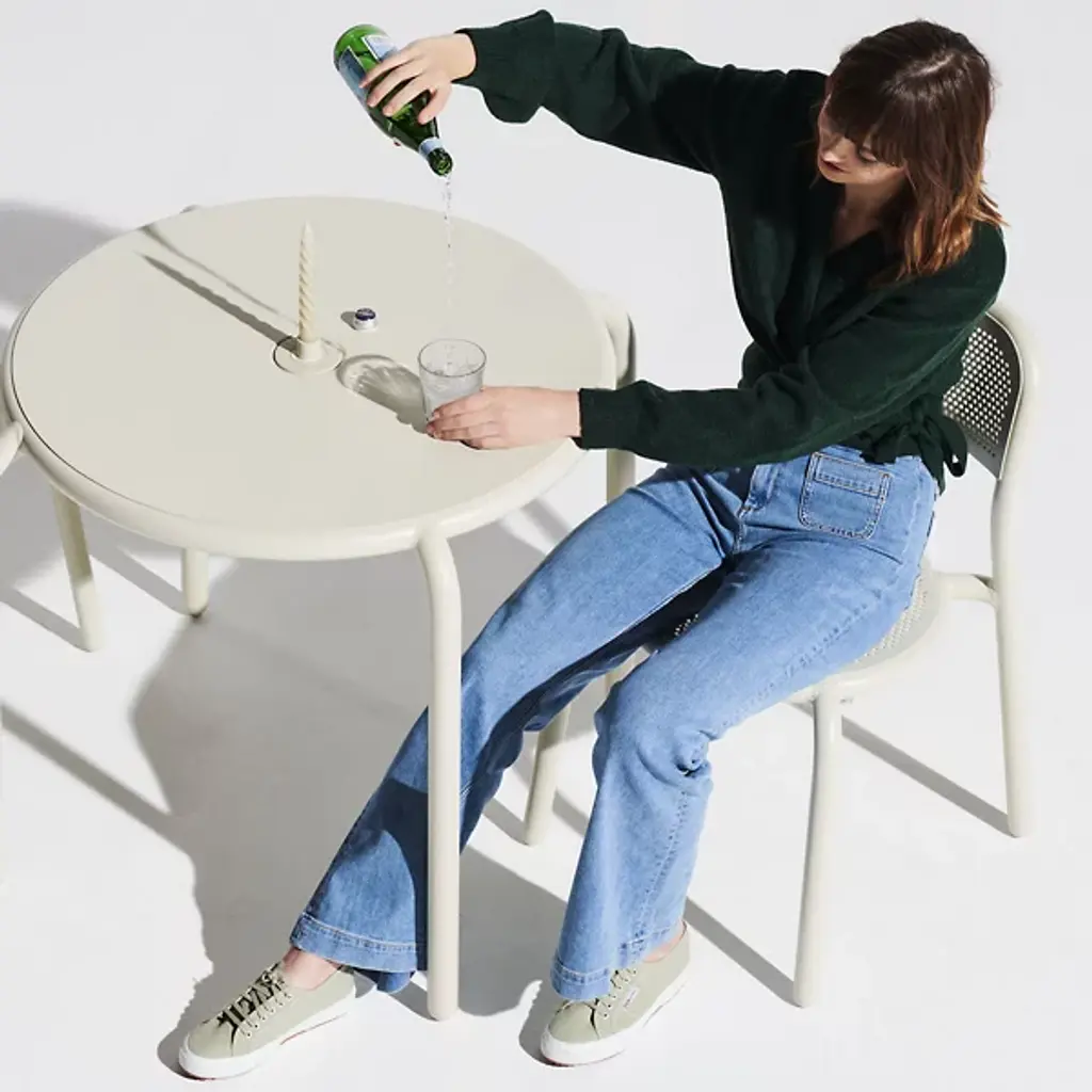 The Toni Tablo Outdoor Dining Table Set with 6 Sidechairs from Fatboy is an ideal enhancement for any patio or outdoor area. Created by designer Erik Stehmann, this contemporary set showcases a bold design using basic materials. The grand table, crafted from lightweight, UV-resistant, all-weather aluminum, is paired with stackable chairs featuring pierced backs to prevent water pooling. The versatile umbrella holder doubles as a candle holder, providing convenience for various weather conditions and times of day. Perfect for both indoor and outdoor use, this set blends functionality with stylish appeal.
