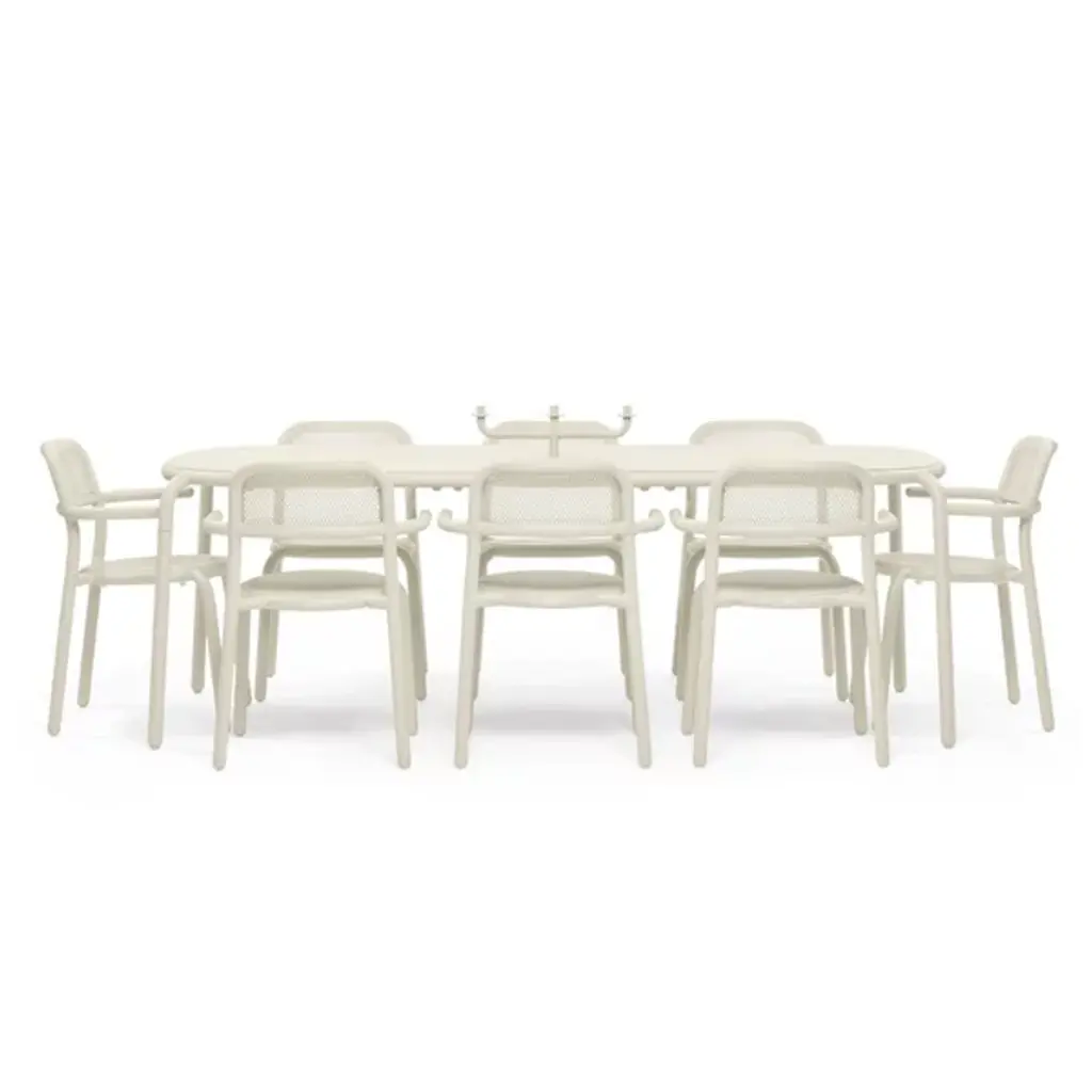 The Toni Tablo Outdoor Dining Table Set with 6 Sidechairs from Fatboy is an ideal enhancement for any patio or outdoor area. Created by designer Erik Stehmann, this contemporary set showcases a bold design using basic materials. The grand table, crafted from lightweight, UV-resistant, all-weather aluminum, is paired with stackable chairs featuring pierced backs to prevent water pooling. The versatile umbrella holder doubles as a candle holder, providing convenience for various weather conditions and times of day. Perfect for both indoor and outdoor use, this set blends functionality with stylish appeal.