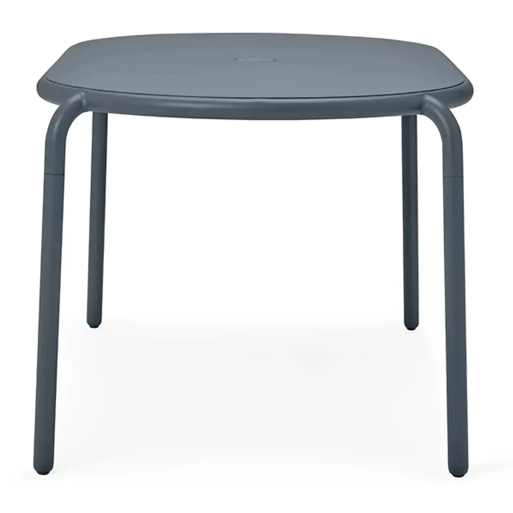 The Toni Tavolo Outdoor Dining Table Set with 4 Armchairs from Fatboy offers an inspired accompaniment to any patio or outdoor space. Designed by Erik Stehmann, this contemporary set features a striking design using durable materials, with outflung legs elevating a central table. The spacious table, crafted from lightweight, UV-resistant, all-weather aluminum, is paired with stackable armchairs with swooping arms and pierced backs to prevent water pooling. The versatile umbrella holder doubles as a candle holder, offering protection from rain, sun, darkness, or mosquitos. This set combines functionality with stylish appeal and is ideal for indoor and outdoor use.