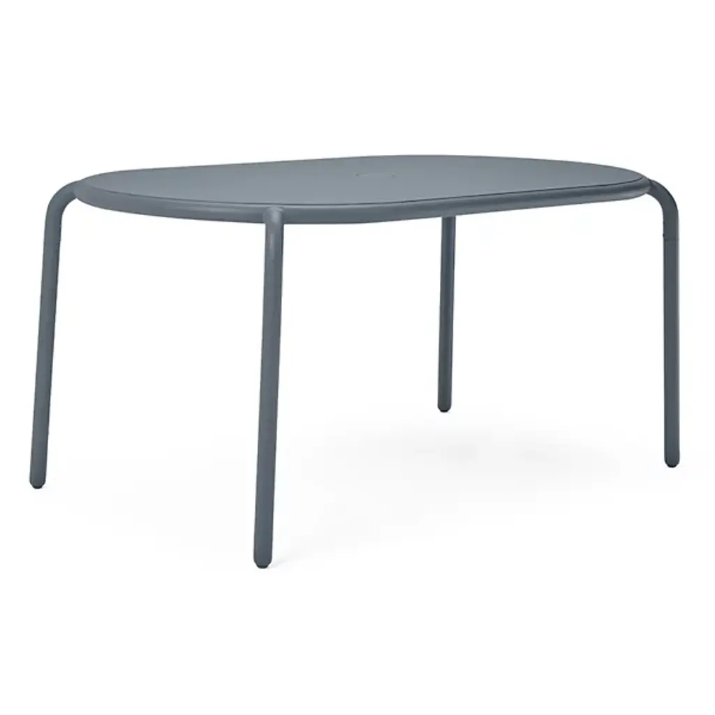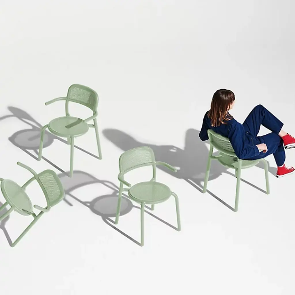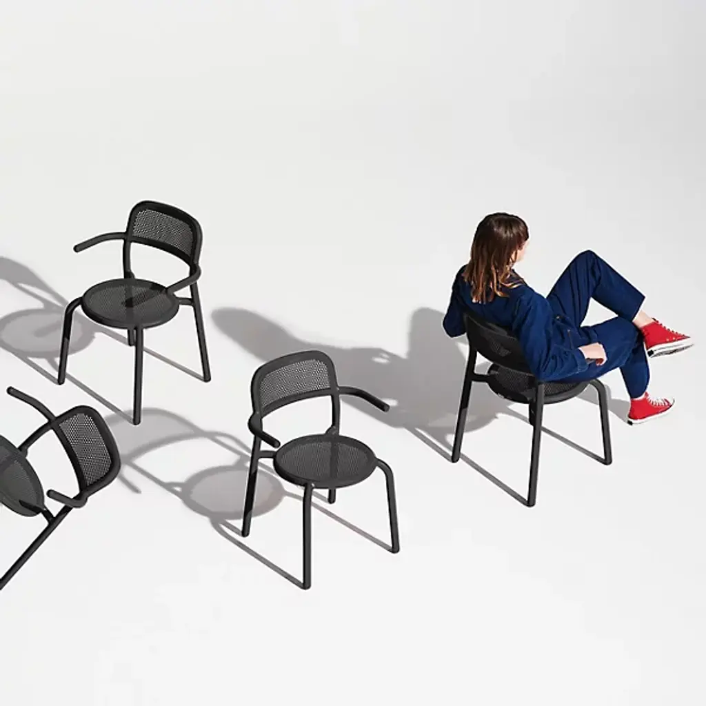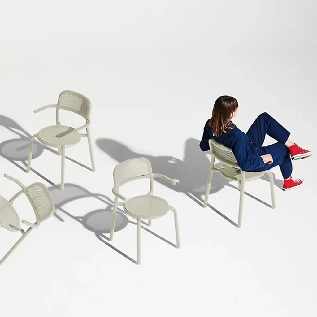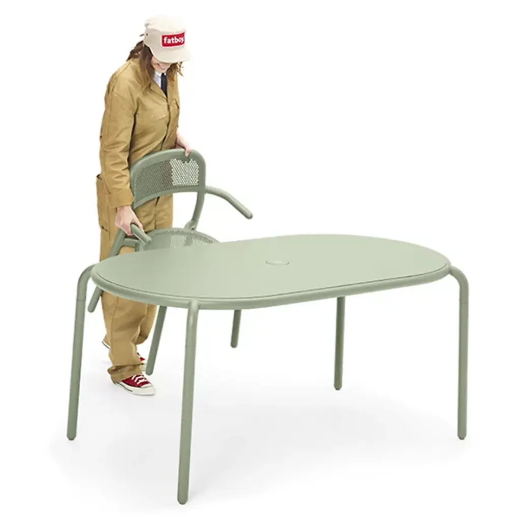 The Toni Tavolo Outdoor Dining Table Set with 4 Armchairs from Fatboy offers an inspired accompaniment to any patio or outdoor space. Designed by Erik Stehmann, this contemporary set features a striking design using durable materials, with outflung legs elevating a central table. The spacious table, crafted from lightweight, UV-resistant, all-weather aluminum, is paired with stackable armchairs with swooping arms and pierced backs to prevent water pooling. The versatile umbrella holder doubles as a candle holder, offering protection from rain, sun, darkness, or mosquitos. This set combines functionality with stylish appeal and is ideal for indoor and outdoor use.