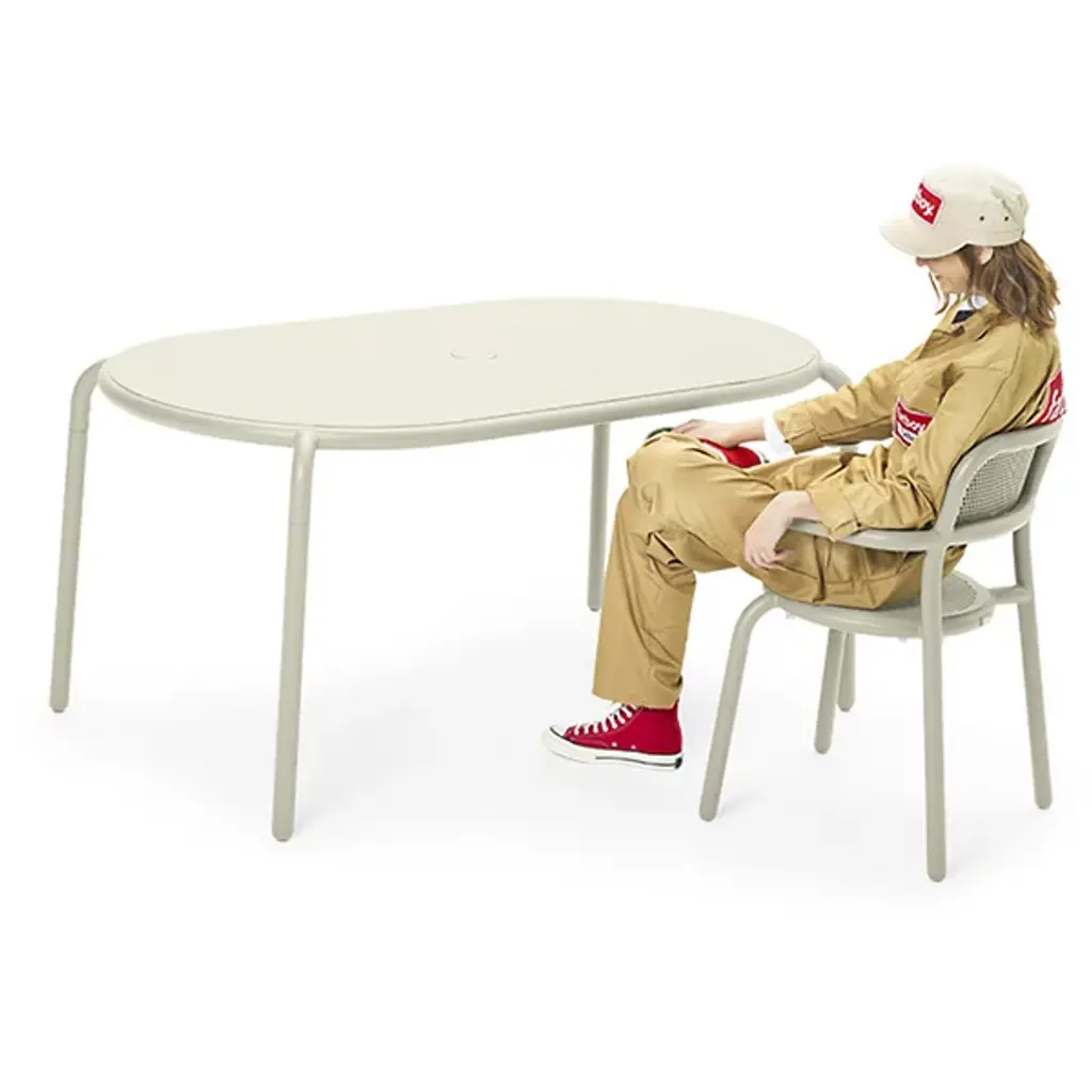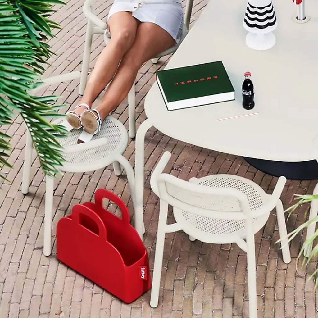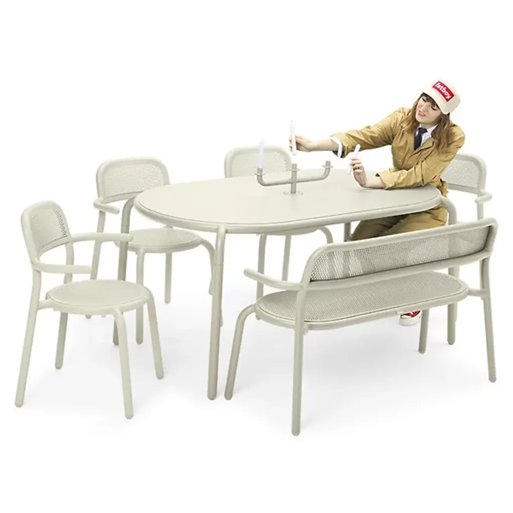 The Toni Tavolo Outdoor Dining Table Set with 4 Armchairs from Fatboy offers an inspired accompaniment to any patio or outdoor space. Designed by Erik Stehmann, this contemporary set features a striking design using durable materials, with outflung legs elevating a central table. The spacious table, crafted from lightweight, UV-resistant, all-weather aluminum, is paired with stackable armchairs with swooping arms and pierced backs to prevent water pooling. The versatile umbrella holder doubles as a candle holder, offering protection from rain, sun, darkness, or mosquitos. This set combines functionality with stylish appeal and is ideal for indoor and outdoor use.