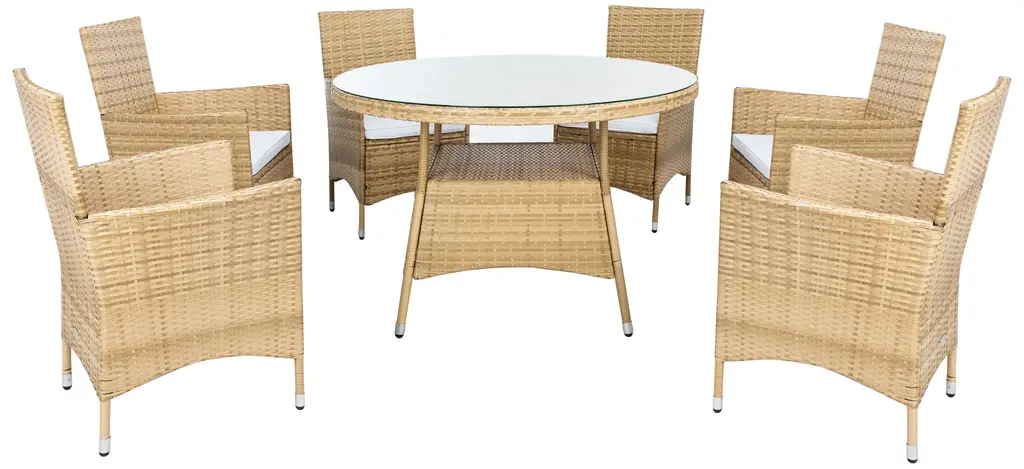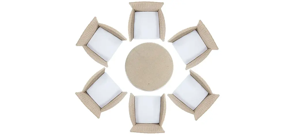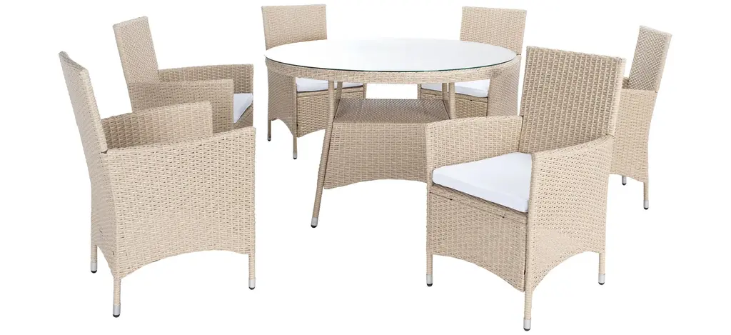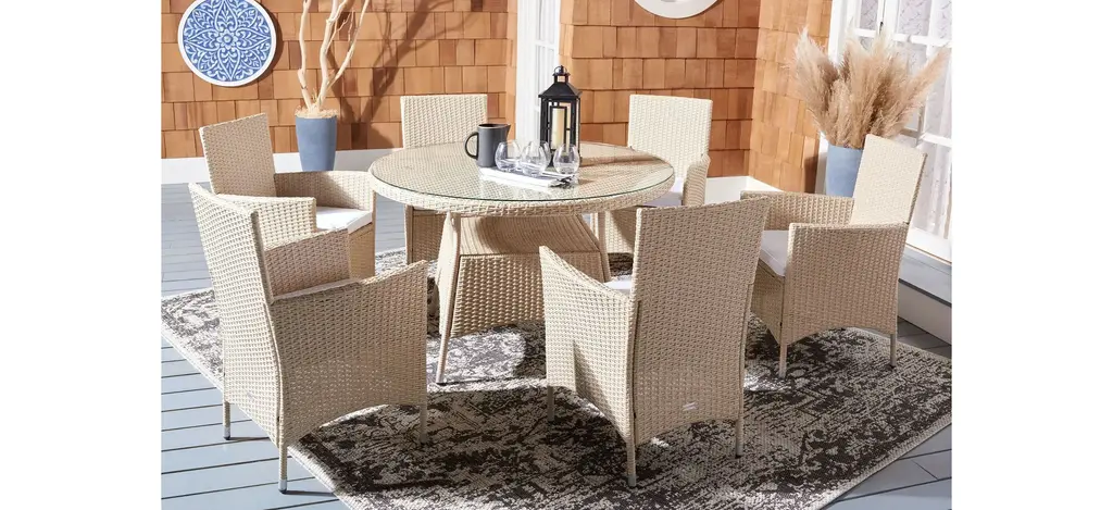 The Torus 7-pc. Outdoor Dining Set elevates outdoor entertaining with substance and style. Torus's six ultra modern chairs are given additional depth and intrigue with woven wicker, pairing perfectly with its round glass topped dining table. Soft seat cushions ensure comfortable hours in the great outdoors.