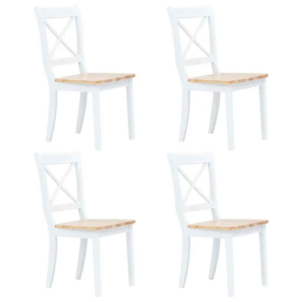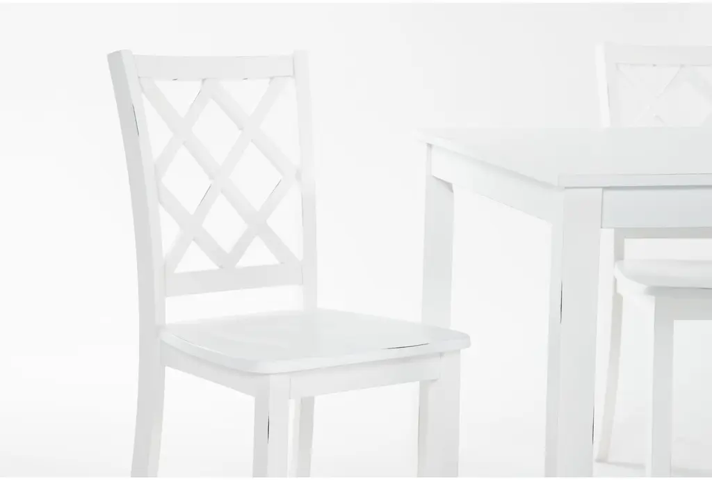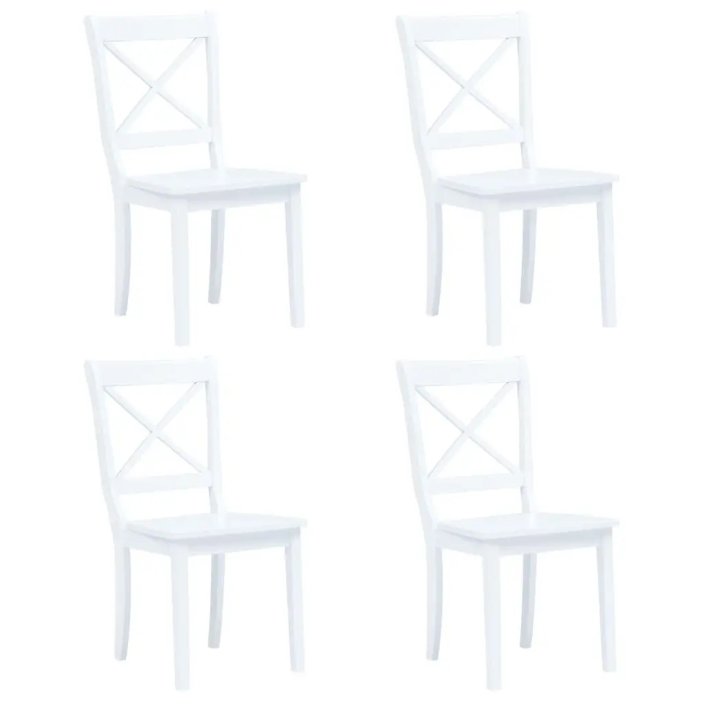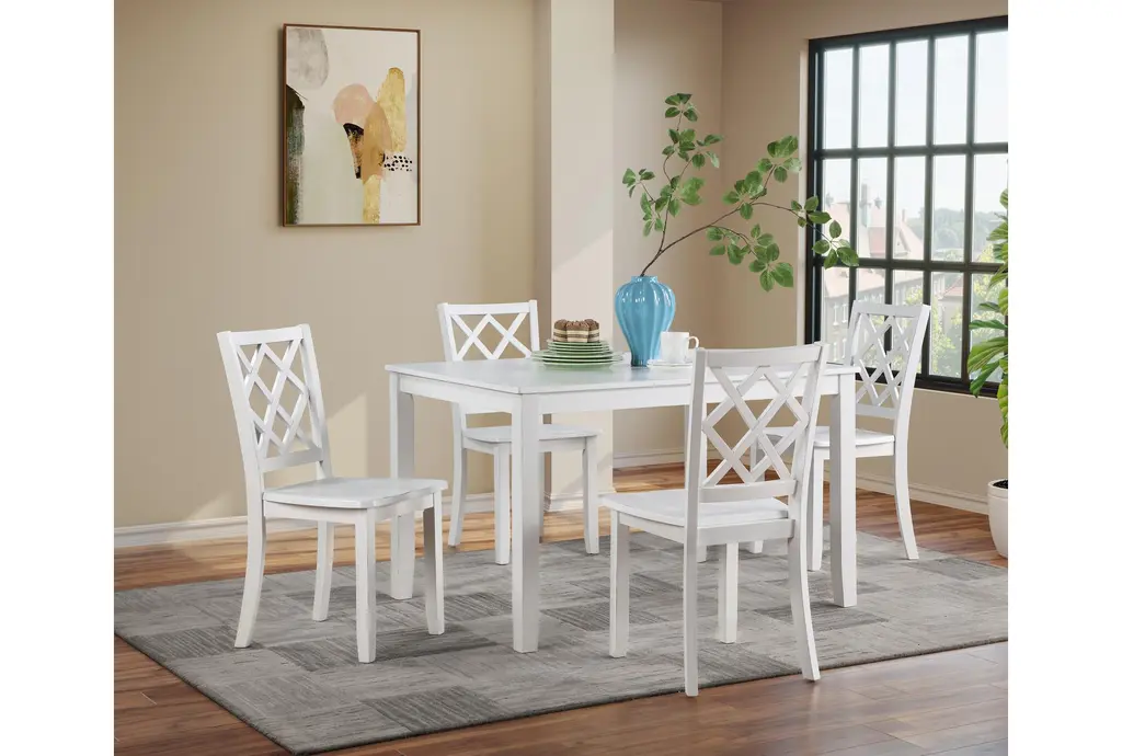 The Trevor White Dining Set for 4 is a perfect blend of casual style and solid construction, making it an ideal choice for any dining space. Crafted from solid rubberwood and birch veneers, this set features a rectangular table and four coordinating chairs with distinct styling. The white finish adds a touch of elegance and neutrality, ensuring it complements any decor.