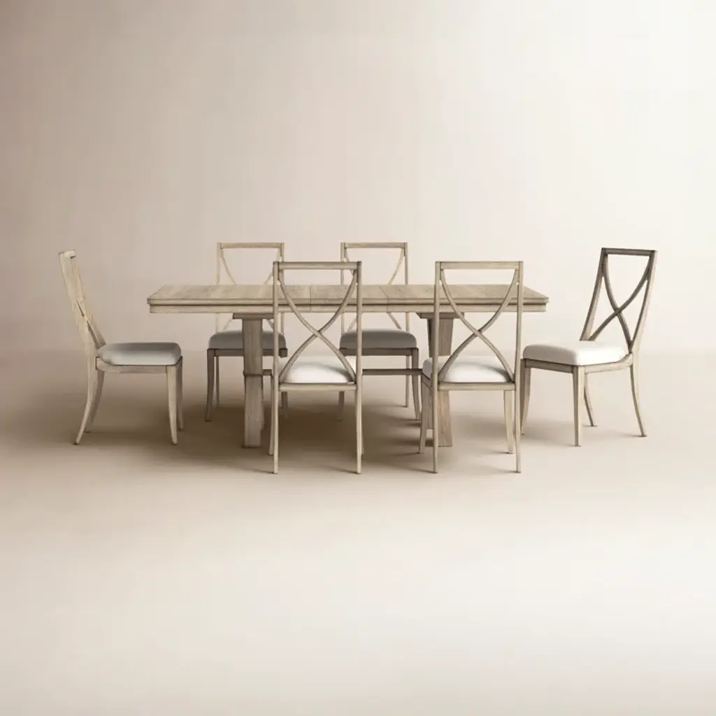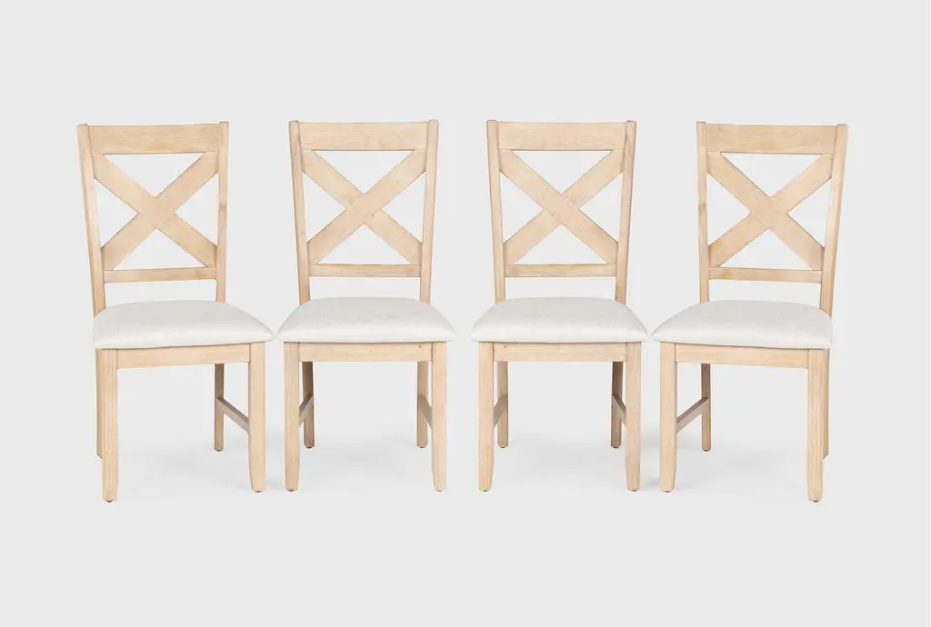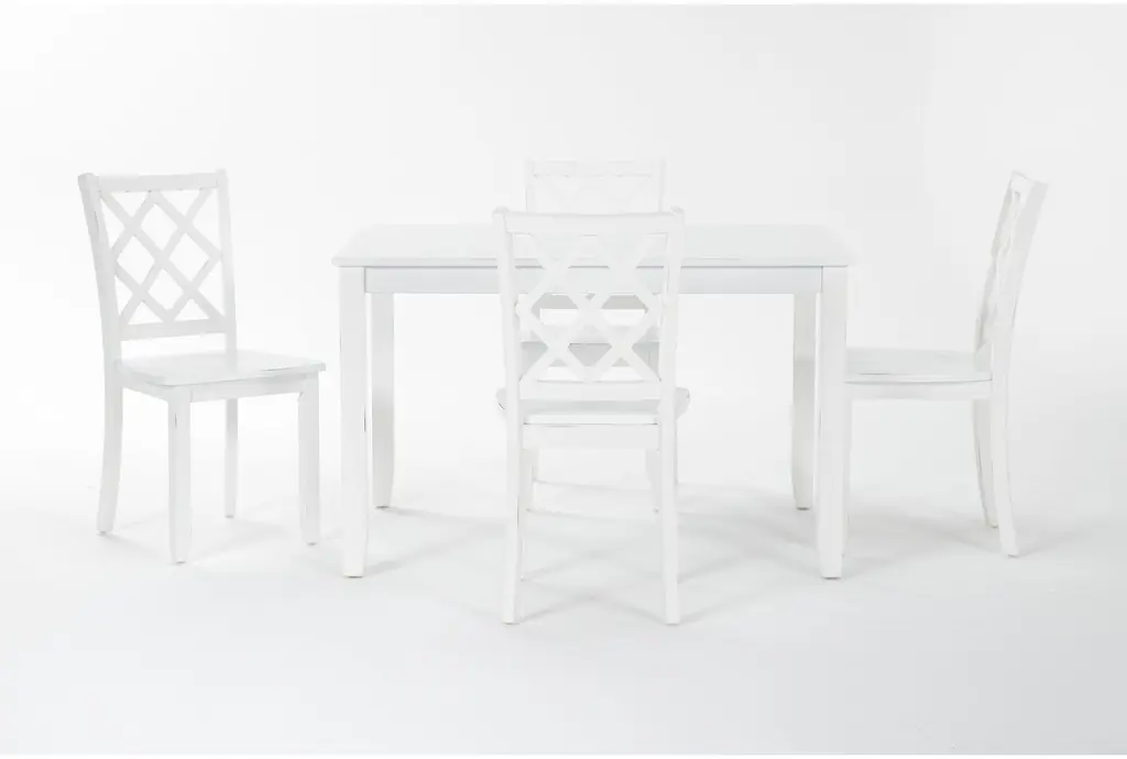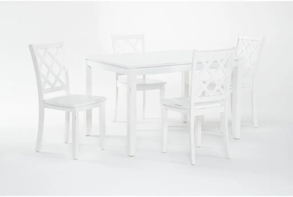 The Trevor White Dining Set for 4 is a perfect blend of casual style and solid construction, making it an ideal choice for any dining space. Crafted from solid rubberwood and birch veneers, this set features a rectangular table and four coordinating chairs with distinct styling. The white finish adds a touch of elegance and neutrality, ensuring it complements any decor.