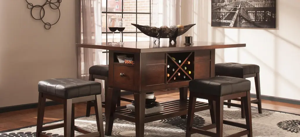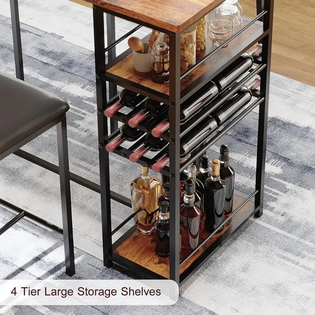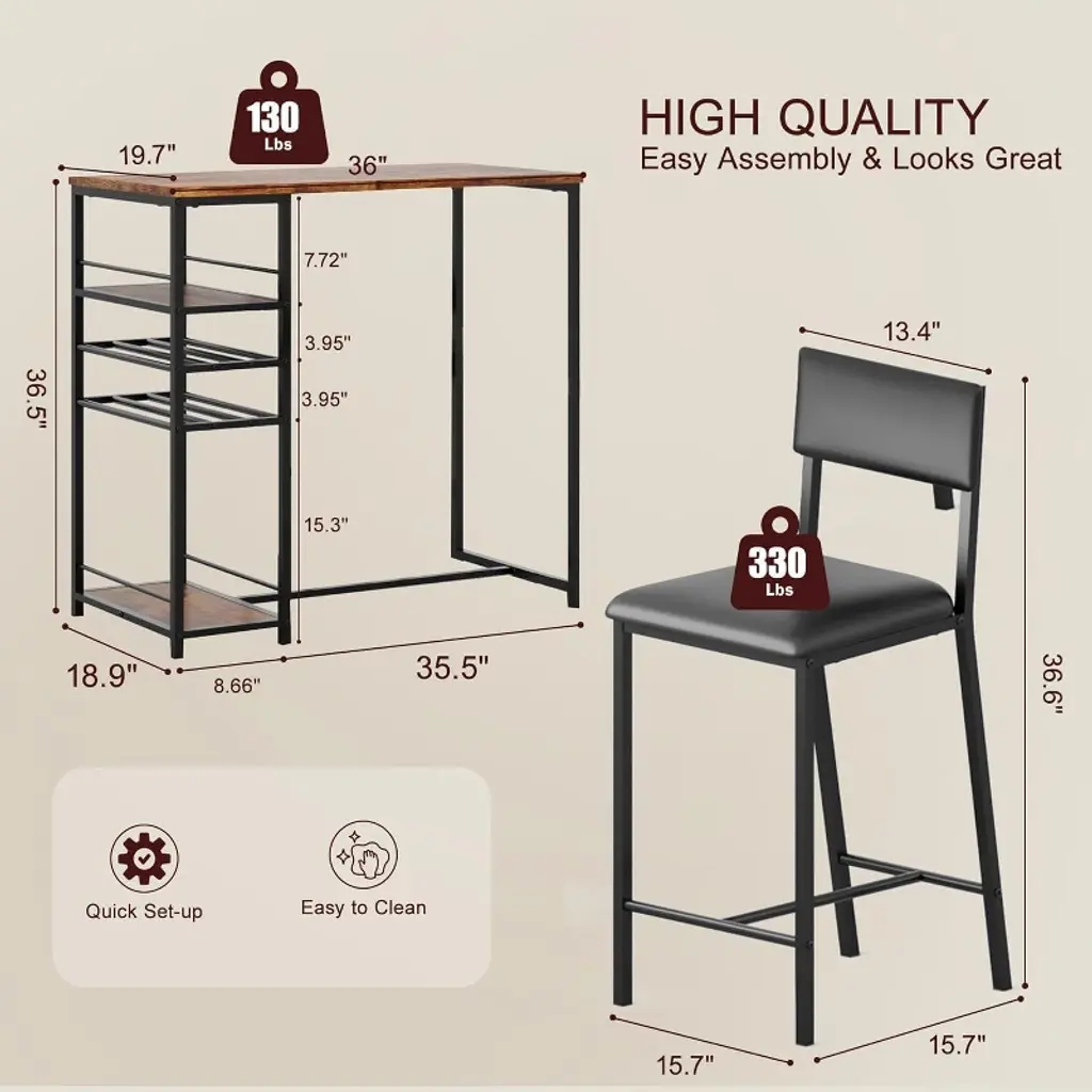 Counter Height Table Set with Stools, Rustic Bistro Set with Storage ShelvesProduct Description:Infuse your home with warm, rustic charm using this beautifully designed counter-height table set. The collection features a rectangular table and two matching padded stools, expertly crafted to deliver both style and exceptional functionality for compact living areas. Its intelligent design incorporates a sturdy, industrial-strength metal frame and a versatile three-shelf storage system, making it an ideal centerpiece for small kitchens, cozy breakfast nooks, or studio apartments. The rich brown finish adds a touch of cozy character to any decor, while the space-saving capability of stools that tuck completely underneath ensures your floor space remains open and uncluttered.Key Features:1. Space-Maximizing Compact Design: Engineered for efficiency, this set saves valuable floor space with stools that slide entirely beneath the table. The table itself features three generously sized storage shelves, providing a practical solution for organizing kitchen essentials, cookbooks, or decorative items, making it perfect for apartments and small homes.2. Industrial-Strength Sturdy Construction: Built for long-lasting durability, the set is constructed with a heavy-duty steel H-frame base and high-quality MDF surfaces. This robust build ensures remarkable stability and supports a weight capacity of up to 330 lbs per piece, guaranteeing worry-free daily use.3. Ergonomic Counter-Height Comfort: Designed for relaxed dining, the stools are padded with thick, high-density foam cushions. The ergonomic 36.5-inch counter height provides a comfortable and natural seating position, ideal for enjoying meals, working on a laptop, or sipping your morning coffee.4. Durable and Easy-Clean Surfaces: The set is protected by a resilient, scratch-resistant, and waterproof coating. This durable finish makes maintenance effortless—simply wipe clean with a damp cloth—and ensures resistance to everyday stains, spills, and wear, preserving its handsome appearance.5. Quick and Hassle-Free Assembly: Enjoy a straightforward setup process that can be completed in under 30 minutes. The set arrives with all necessary tools and clear, illustrated instructions, guiding you through an easy assembly without the need for special skills or additional equipment.Specifications:• Table Dimensions: 36" L x 19.7" W x 36.5" H• Stool Dimensions: 15.7" L x 15.7" W x 36.6" H• Materials: Powder-Coated Steel Frame, MDF Surfaces• Color: Warm Rustic Brown• Weight Capacity: 330 lbs per piece• Features: 3-Tier Storage Shelves, Fully Tuckable Stools, Scratch-Resistant Coating• Set Includes: 1 Table, 2 Stools, All Assembly Hardware
