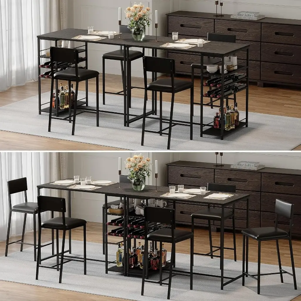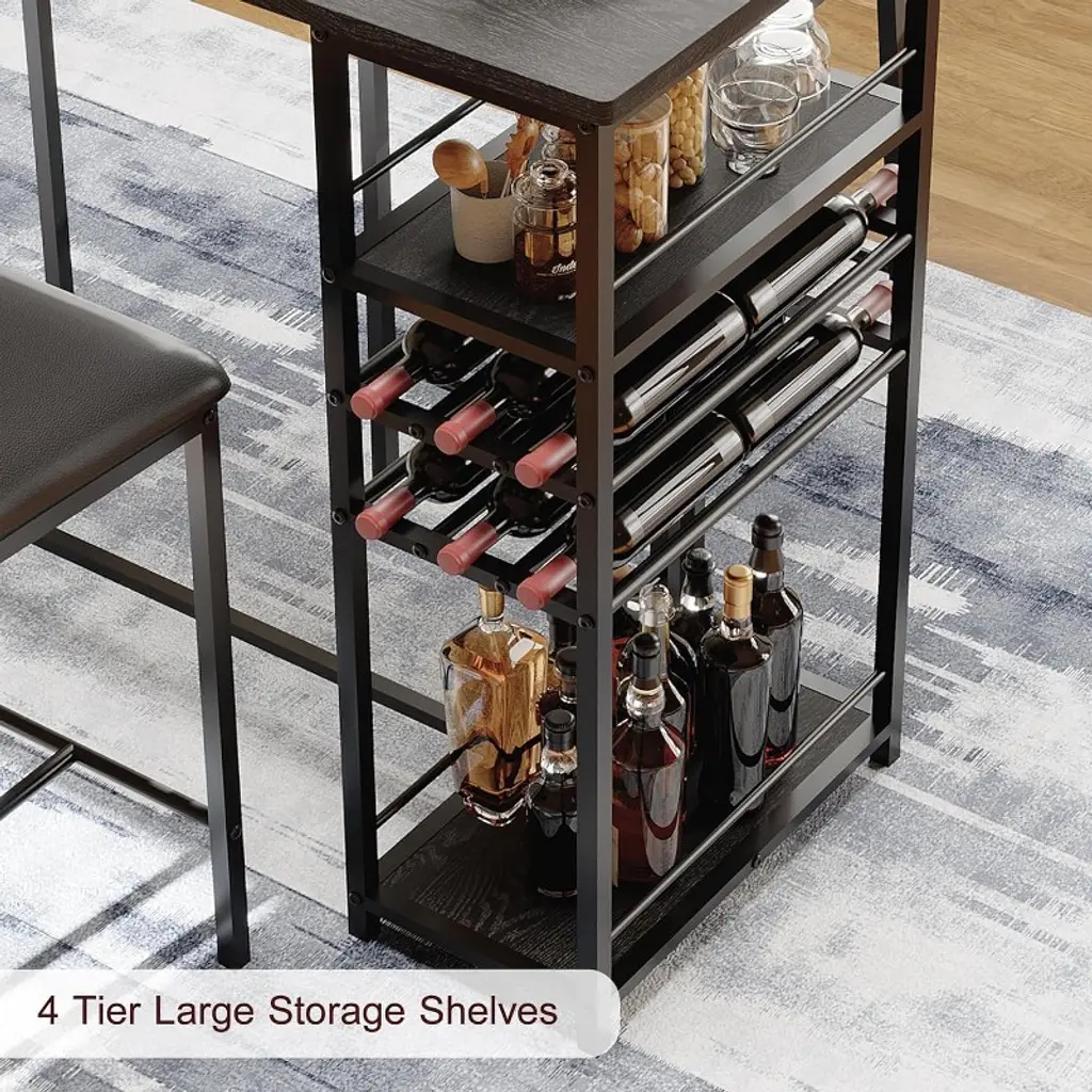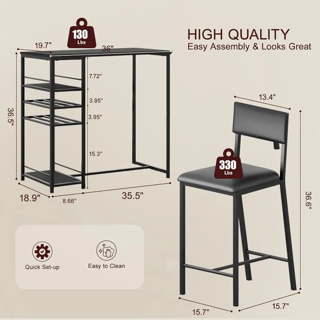Counter Height Table Set for 2 with Storage, Modern Bistro Set for Small SpacesProduct Description:Transform your compact living area with this modern counter-height bistro set, designed to maximize both style and functionality. This sleek gray set includes a rectangular table with integrated storage shelves and two matching padded chairs, creating an ideal dining solution for urban apartments, cozy kitchens, or studio layouts. The design combines an industrial-chic powder-coated steel frame with durable MDF surfaces, offering a perfect blend of contemporary aesthetics and robust construction. The space-conscious design allows the chairs to tuck completely beneath the table, while the three-tier shelving provides valuable storage, making it as practical as it is stylish.Key Features:1. Intelligent Space-Saving Design: Engineered for compact living, this set features a table with a slim profile and chairs that slide fully underneath, freeing up significant floor space. The table includes three practical open shelves, perfect for storing items like cookbooks, kitchen essentials, or decorative accents, helping you keep your area organized and clutter-free.2. Robust Industrial-Strength Build: Enjoy lasting durability with a commercial-grade construction. The table and chairs are supported by reinforced steel H-frame bases, providing exceptional stability and a remarkable weight capacity of 330 lbs per piece. This ensures reliable performance and peace of mind for daily use.3. Elevated Ergonomic Seating: Designed for comfort at counter height, the chairs feature plush, high-density foam cushions. The 36.5-inch table height and supportive chair design create an ergonomic and comfortable spot for dining, working, or socializing, reducing strain during extended sitting.4. Durable and Easy-Clean Surfaces: The set is finished with a resilient, scratch-resistant coating that simplifies maintenance. The waterproof surfaces can be easily wiped clean with a damp cloth, resisting stains and spills to maintain its sophisticated modern gray appearance through everyday life.5. Quick and Straightforward Assembly: Get your set ready in about 30 minutes with a hassle-free assembly process. The package includes all necessary tools and a clear, visual step-by-step guide, allowing for easy setup without the need for special skills or additional equipment.Specifications:• Table Dimensions: 36" L x 19.7" W x 36.5" H• Chair Dimensions: 15.7" L x 15.7" W x 36.6" H• Materials: Powder-Coated Steel Frame, Premium MDF Surfaces• Color: Modern Gray• Weight Capacity: 330 lbs per piece• Features: 3-Tier Storage Shelves, Fully Concealable Chairs, Scratch-Resistant Coating• Set Includes: 1 Table, 2 Chairs, Assembly Hardware