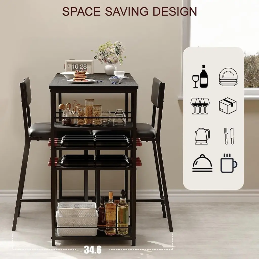 Tropow Dining Table Set For 2, Bar Table And Upholstered Chairs With Storage Shelves For Small Space, Apartment