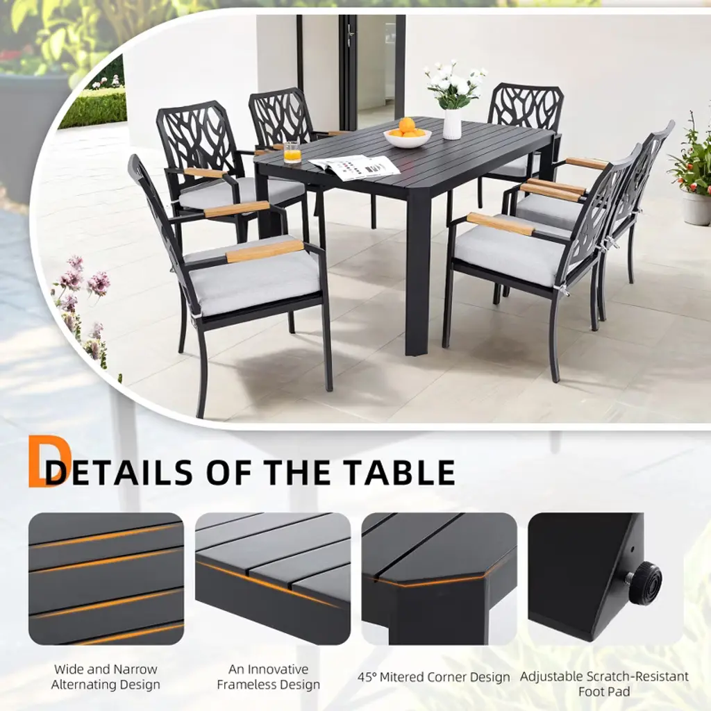 This outdoor patio furniture set includes a 37.4"*59.0" rectangular table, 6 dining chairs, all designed for comfortable outdoor relaxation. The aluminum frame is rust-resistant and powder-coated for weather durability. The table features an innovative frameless design with alternating wide and narrow aluminum slats, a 2" umbrella hole, and refined 45° angled corner cuts for enhanced safety and visual appeal. The chairs feature a nature-inspired, branch-like backrest that blends elegance with a modern aesthetic, complemented by FSC-certified, resin-treated wood armrests. Both the table and chairs showcase corner cuts, adding a fresh, innovative design element. Outdoor-grade cushions in Sunbrella fabric ensure comfortable seating.This set is perfect for small gatherings or relaxing outdoor moments.