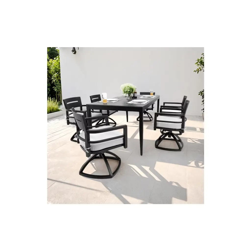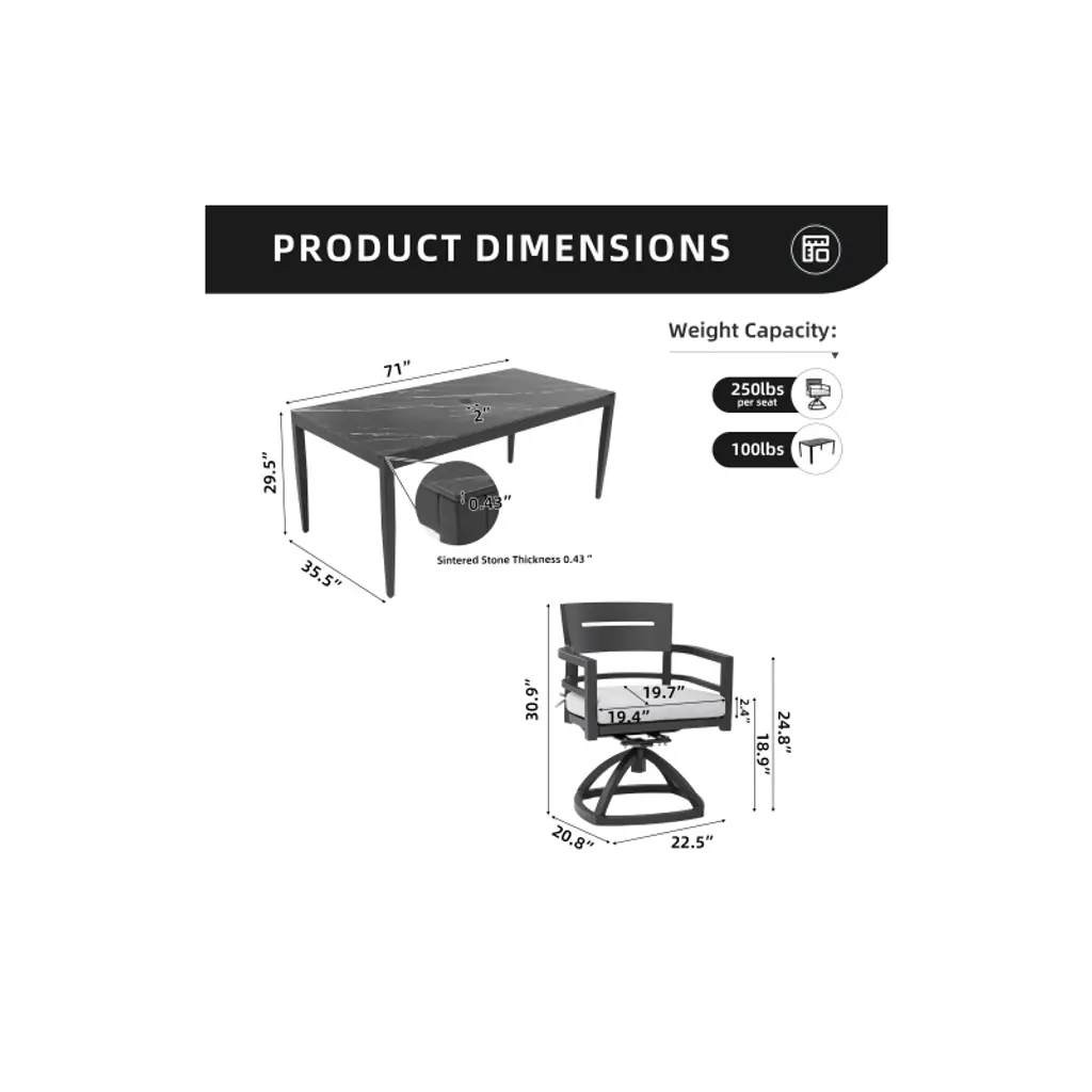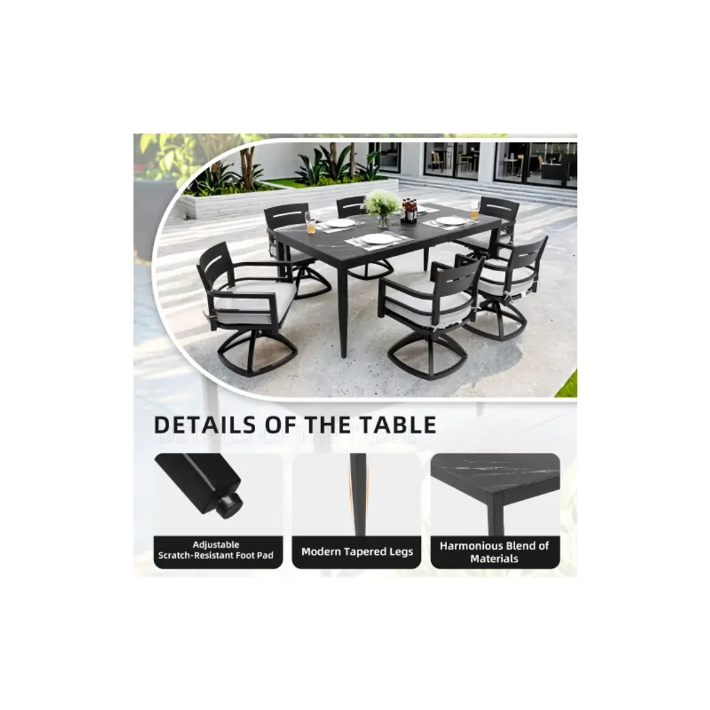 Enhance your outdoor space with this Modern 7-Piece Aluminum Dining Set, featuring a 35.5”x71” rectangle dining table with a black marble-look sintered stone top, Ember Black powder-coated frame, and 2” umbrella hole. Includes 6 swivel rockers offering front-to-back rocking and 360-degree rotation, featuring Sunbrella fabric cushions for fade resistance and easy maintenance. The adjustable scratch-resistant foot pads on the table, plus scratch-resistant pads on the rockers, ensure stability and floor protection. Designed for weatherproof and rust-free performance, this set is perfect for poolside, patios, or balconies, offering luxury, comfort, and modern elegance for outdoor dining and relaxation.