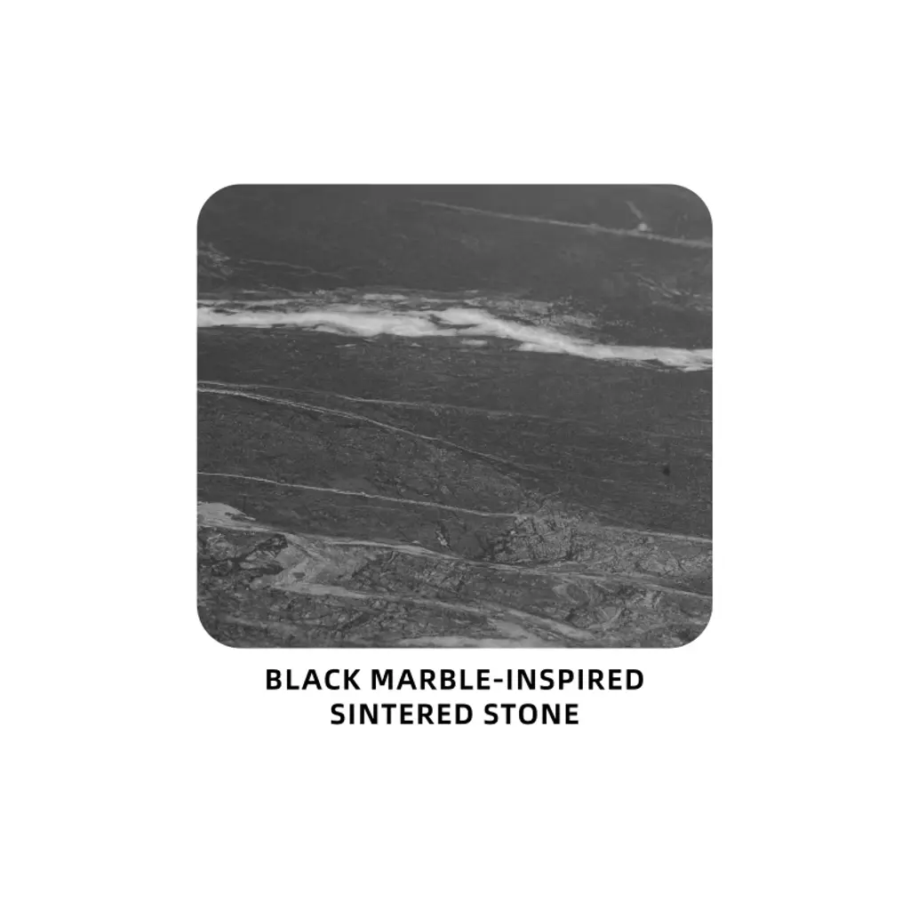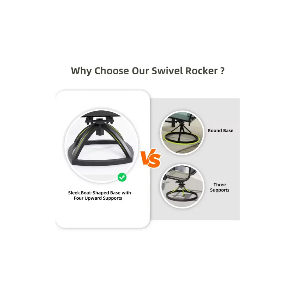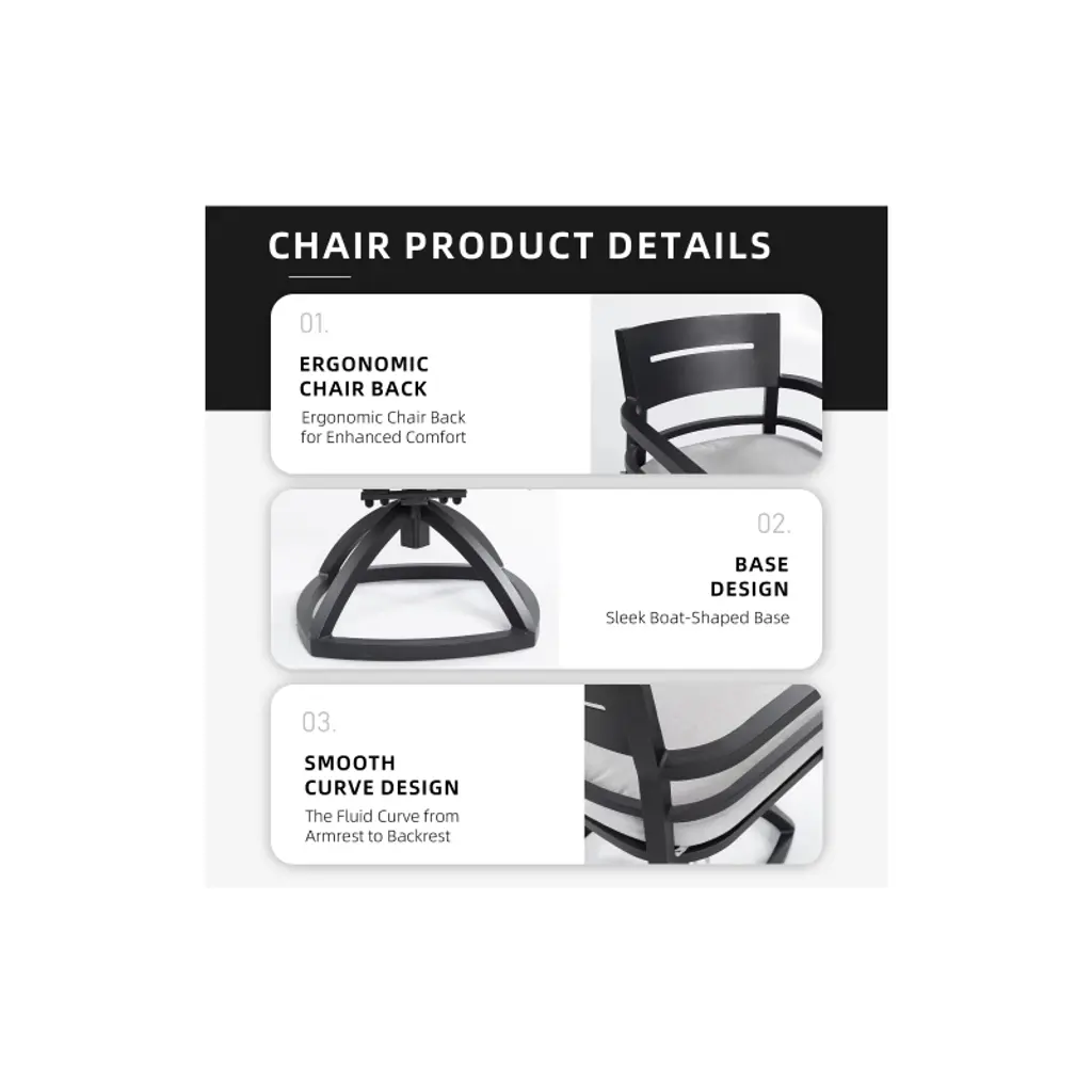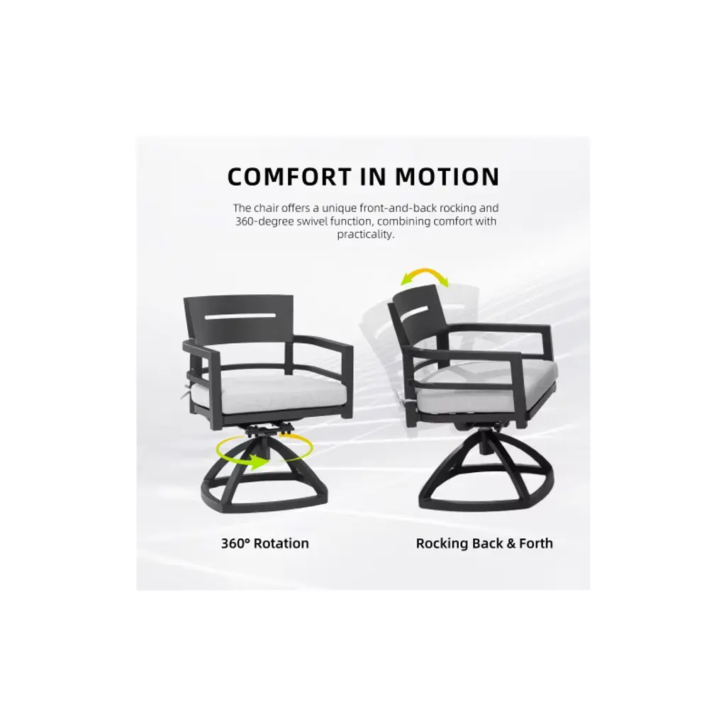 Enhance your outdoor space with this Modern 7-Piece Aluminum Dining Set, featuring a 35.5”x71” rectangle dining table with a black marble-look sintered stone top, Ember Black powder-coated frame, and 2” umbrella hole. Includes 6 swivel rockers offering front-to-back rocking and 360-degree rotation, featuring Sunbrella fabric cushions for fade resistance and easy maintenance. The adjustable scratch-resistant foot pads on the table, plus scratch-resistant pads on the rockers, ensure stability and floor protection. Designed for weatherproof and rust-free performance, this set is perfect for poolside, patios, or balconies, offering luxury, comfort, and modern elegance for outdoor dining and relaxation.