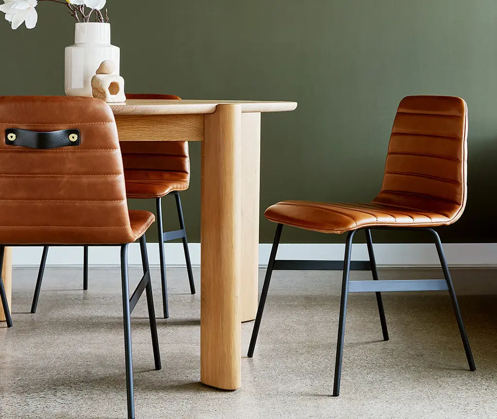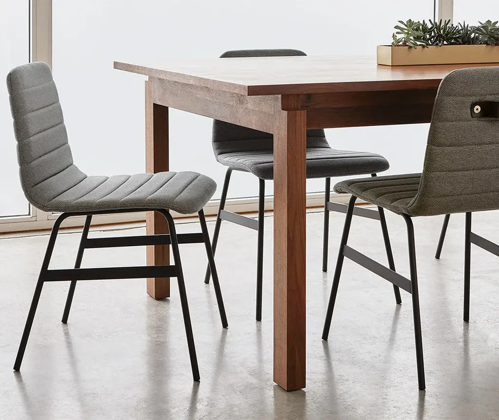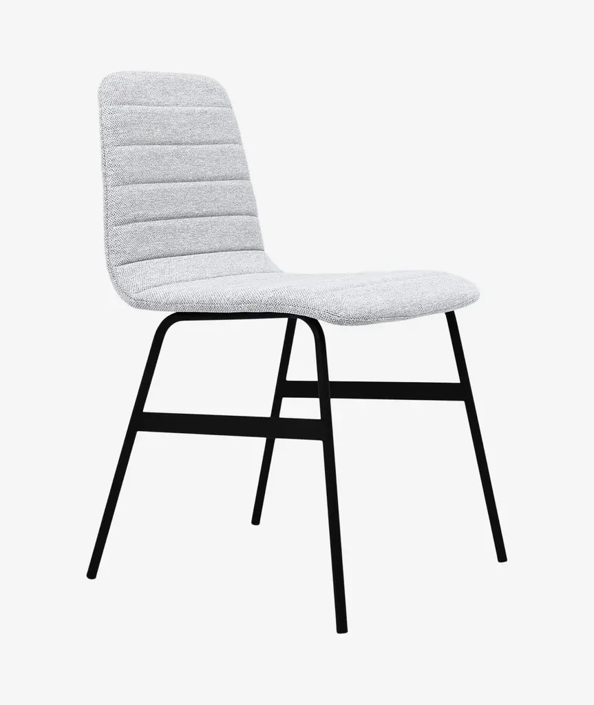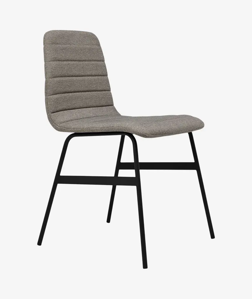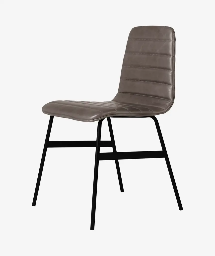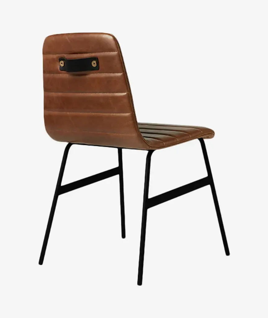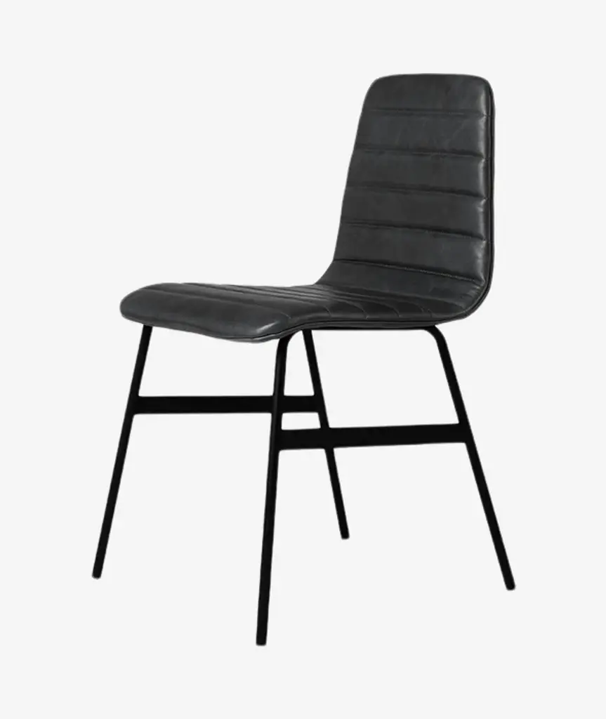 The Lecture Chair is a modern reinterpretation of a classic elementary school chair design. This version features a one-piece, upholstered seat and back, with unique, channel-stitch detailing. The back incorporates a functional leather and brass handle. The black, powder-coated steel legs are reinforced with solid metal stabilizers. Functional, comfortable and stylish, the Lecture Chair works well for any workspace or dining area.