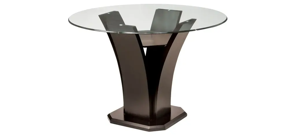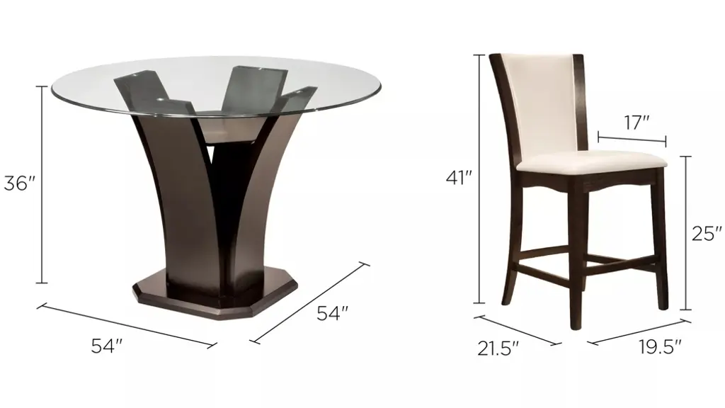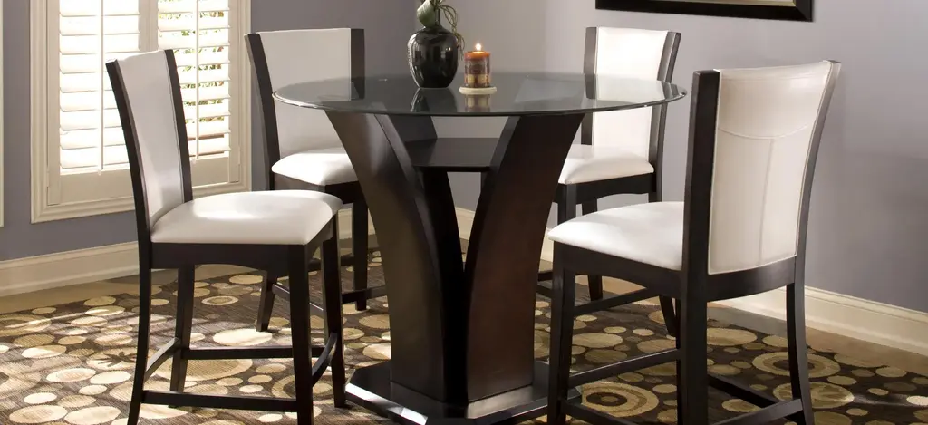 This Venice 5-pc. 54" glass counter-height dining set combines the small-scale coziness of casual dining with a more formal feel. The table features an elegant tulip base and a beveled glass tabletop that provides an open, airy feel. Plus, the easy-to-clean, faux leather chair seats provide a luxurious look.