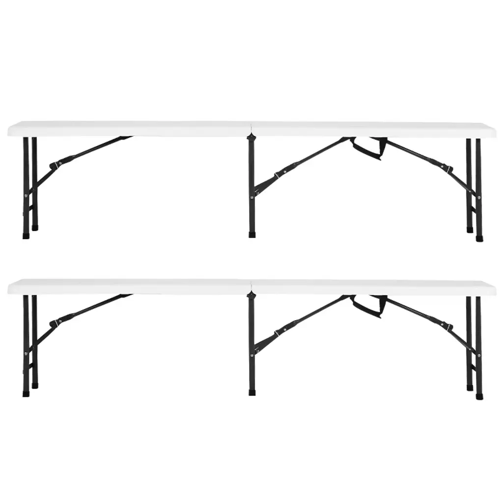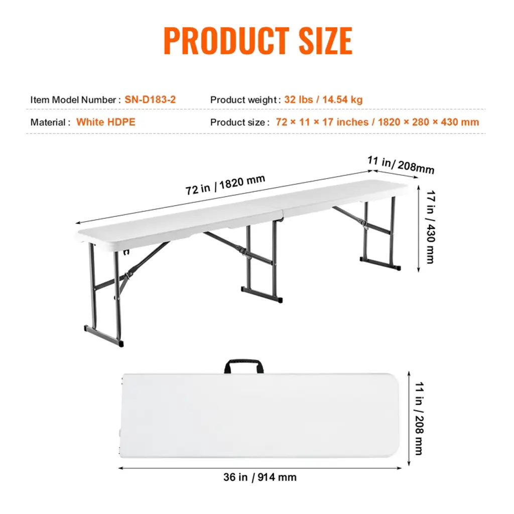 Feature: Comfortable Seating: This 72x11x17 inch / 1820x280x430 mm (2-piece ) 6FT folding bench is highly portable and lightweight, providing comfortable seating with no assembly required. Simply unpack and use. Easy to Fold and Move: This plastic folding bench is easy to transport and features an efficient storage design that maximizes space utilization. Ideal for both outdoor and indoor use, sports fields, parties, gatherings, and commercial venues where instant seating is needed, setup is completed in seconds. Safe and Stable: The legs are made of coated heavy-duty fork legs with 19x1 mm iron tubing, ensuring durability and reliability. The double horizontal bar leg design offers stable structure, making it safe and secure, preventing tipping. Easy to Clean: Featuring a 4cm thick high-quality HDPE panel, this outdoor picnic party camping dining seat provides comfort, is waterproof, stain-resistant, durable, and easy to clean. Versatile Application: The portable outdoor bench has an elegant and simple design, available in classic white, making it suitable for a variety of indoor and outdoor occasions such as weddings, BBQ parties, and more. Package Content 2 x Portable Folding Benches 1 x Instruction