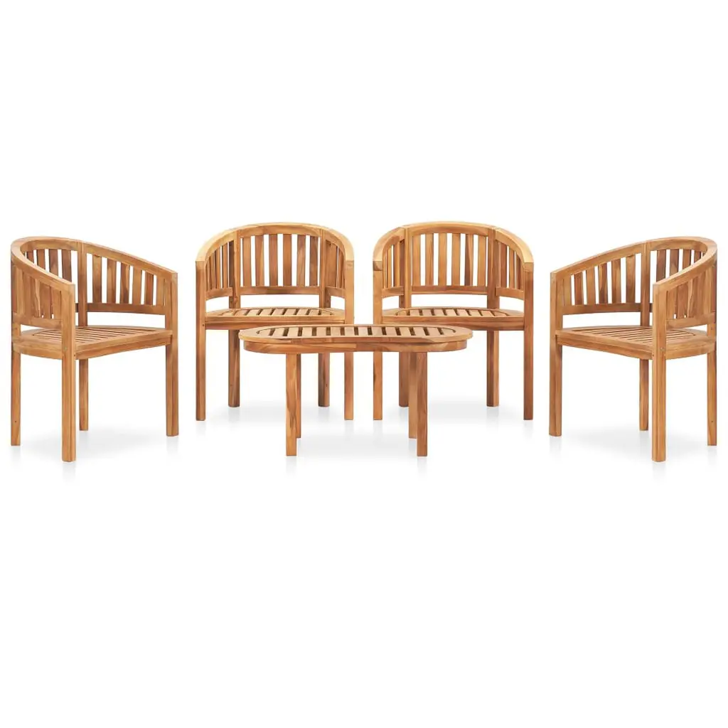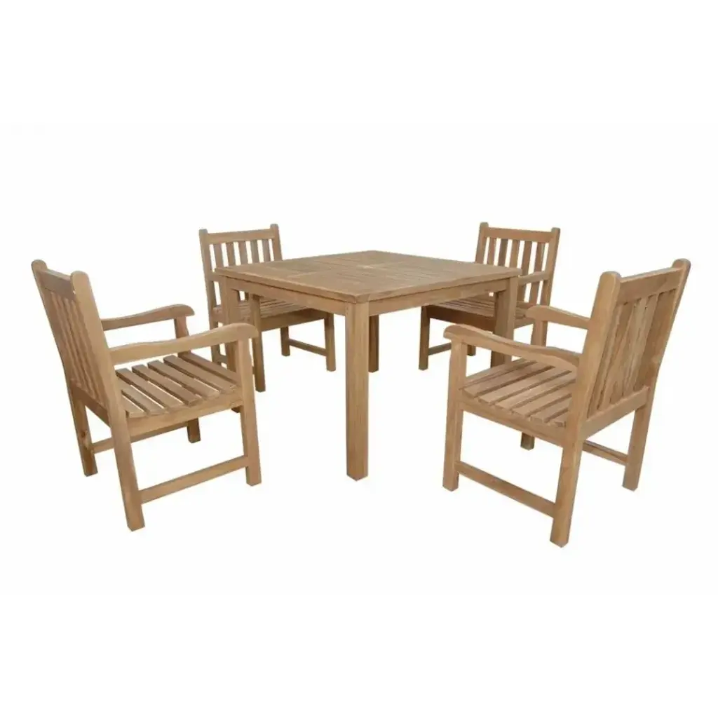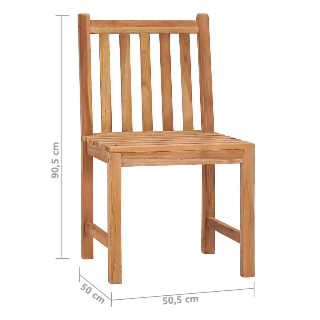 This wooden garden dining set adds a touch of natural charm to your kitchen, garden, or patio.Constructed from extremely durable teak hardwood, this piece of teak furniture has been seasoned, kiln-dried, and then fine sanded to give a very smooth appearance. Teak wood is known for its exceptional strength and weather resistance, making it far more suitable for garden furniture than any other kind of wood. Teak wood is the perfect choice if you want to purchase a long-lasting piece of garden furniture.A beautiful water-based finish is applied to give the wood a warm color. Thanks to the extra thick tabletop and big legs, this solid wood table is very durable and can comfortably accommodate your guests. The chairs feature a refined look that can instantly blend into any living space. With its water-proof feature and classic look, you can place this furniture set anywhere around your sweet home – indoors or outside!