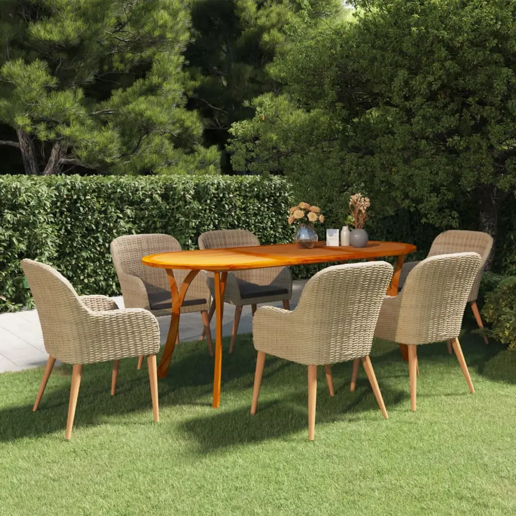 Create a compelling and cohesive aesthetic in your patio space with this patio dining set!This patio table is made of solid acacia wood, making it sturdy and stable. The oil-finished surface also makes the table easy to clean with a damp cloth. Additionally, the curved legs contribute to its stylish design. Featuring a steel frame covered with weather-proof PE rattan, these dining chairs are sturdy and easy to clean. The thickly padded cushions add comfort in your lounging time.Note: In order to extend the life of your outdoor furniture, we recommend you to clean it regularly and do not leave it outdoors without protection unnecessarily.Clean: Use a mild soap solutionStoring: If possible, store in a cool, dry place indoors. If the product is stored outdoors, protect it with a waterproof cover. Wipe and dry the excess water or snow from flat surfaces after a rain or snowfall. Allow sufficient air circulation to avoid moisture-related damage.