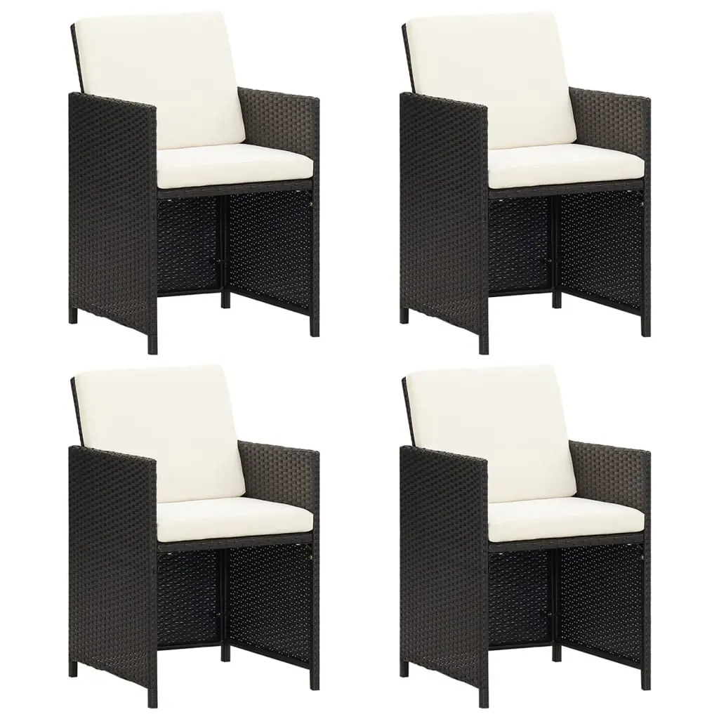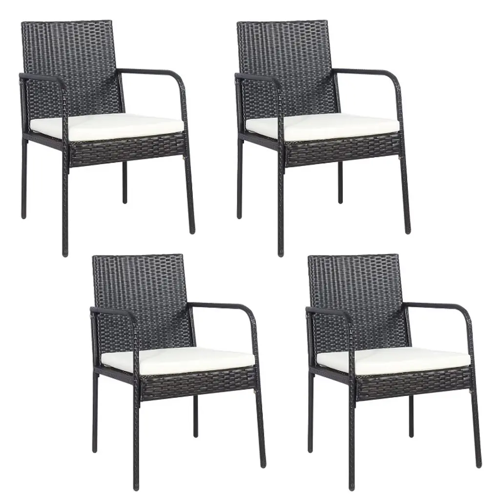 This 4-piece garden dining chair set gives you the perfect mix of style and comfort for your outdoor spaces. With a sleek, modern design, these chairs made from top-notch poly rattan and powder-coated steel are ideal for chilling on your patio, terrace, or in your garden, making them a great addition to your outdoor dining. Weather-Resistant Material: Built with tough poly rattan and powder-coated steel, these chairs can take on the elements. The UV-resistant and waterproof features help them keep their look and function over time, perfect for outdoor fun.Comfortable Seating: Each chair includes plush, weather-resistant cushions that make sitting a pleasure. The removable covers make cleaning super easy, keeping your dining area looking sharp.Stylish Design: These chairs' modern style fits perfectly with any outdoor decor. Their classy black finish adds a nice touch of elegance to your garden or patio, making them ideal for get-togethers.Lightweight and Portable: Designed to be lightweight, these chairs are easy to move around in your outdoor area. Whether you’re hosting a barbecue or having a peaceful evening, they’re quick to adapt to your needs.Easy Assembly: With simple assembly steps and just basic tools needed, putting these chairs together is straightforward. Enjoy your outdoor furniture without the stress of complex setups.