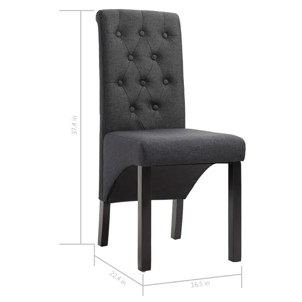 This set of 6 dark gray fabric dining chairs is a stylish and comfy must-have for any dining space. With a traditional look and sturdy build, these chairs create a welcoming vibe for family meals and gatherings. Ergonomic Design: Smartly shaped backrest and comfy seat depth for long meals without a sore backside.Natural Vibe: Solid rubber wood legs bring not just stability but a warm, natural feel to your space.Versatile Use: Fits well in both modern and traditional setups, perfect for dining areas, kitchens, and even as extra seating elsewhere.Durable Material: High-quality fabric makes these chairs look good and easy to keep fresh with just a quick wipe.Size & Capacity: Each chair measures 16.5 in wide and 16.1 in deep, giving plenty of space for one adult.