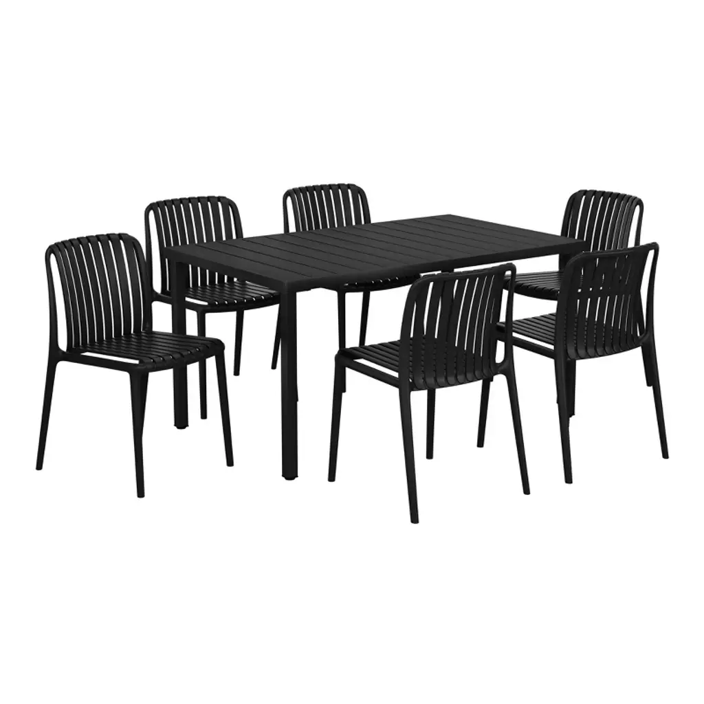 This 5-piece black garden dining set perfectly combines style and functionality, making it a top pick for outdoor dining. It has a spacious rectangular table and four comfy chairs that fit right in with any outdoor setting, giving you a snazzy spot to enjoy meals with family and friends. Premium Materials: The table sports a sturdy tempered glass surface held up by durable powder-coated steel legs, making sure it lasts and stands up to outdoor use.Comfort Design: Each chair is made with a comfy cotton seat and backrest, making for relaxed dining.Efficient Space: The compact structure of the set makes it ideal for various outdoor settings, whether it’s a quiet meal on your balcony or a lively gathering in your garden.Weather-Resistant: Made for outdoor use, this set can handle the weather, allowing for year-round enjoyment.Easy Assembly: Just a bit of assembly is needed. Two people can easily put it together with a simple screwdriver, making it a breeze for users.