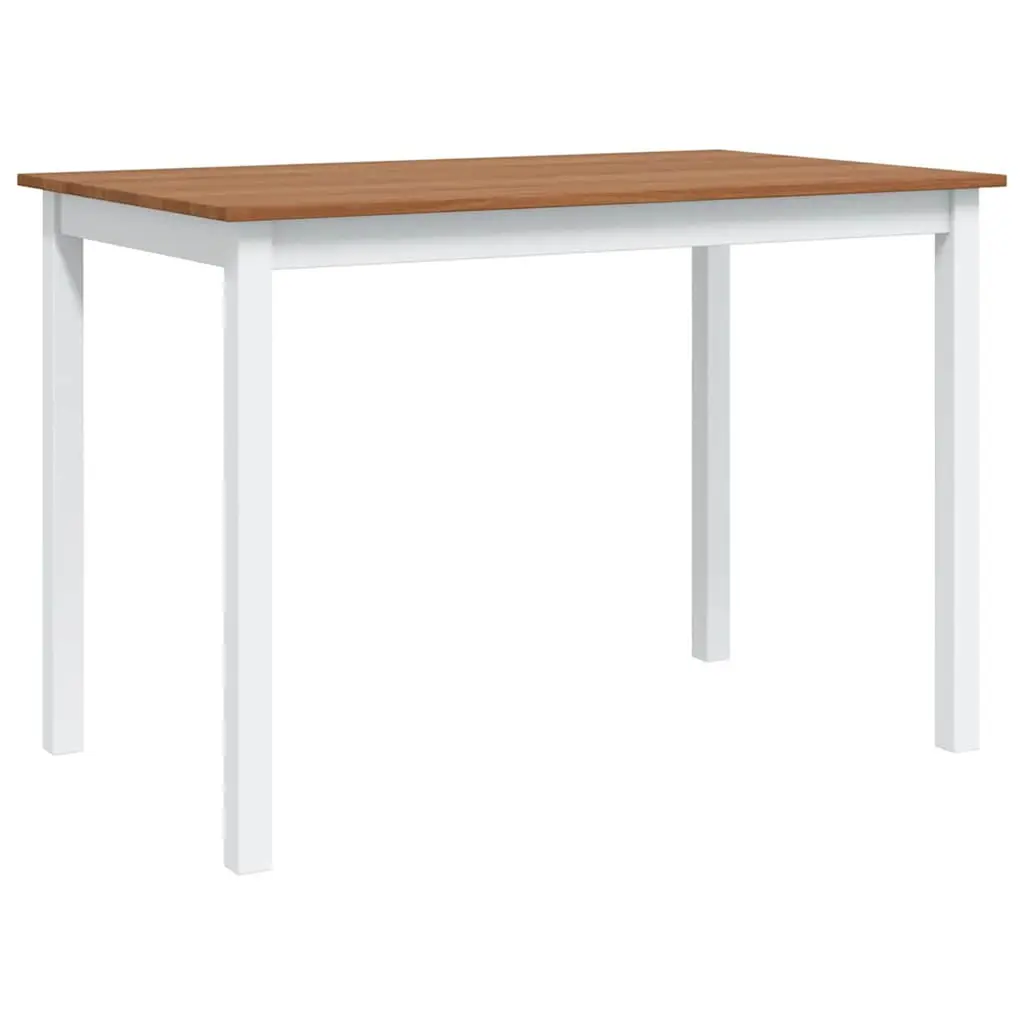 This Modern Rectangular Dining Set, made from solid pine wood, is a great mix of style and function, perfect for making your dining experience better. With its lovely brown and white finish, it comes with a big table and four comfy chairs, making it a standout choice for family meals, entertaining friends, or just enjoying dinners at home. Stylish Design: The combination of brown and white gives it a nice look, fitting in with many interior styles, whether modern or traditional. This beautiful dining set not only does its job but also boosts the overall decor of your space.Sturdy Build: Built from solid pine wood, this set is super durable, standing up to everyday wear and keeping its good looks for ages. The lacquer finish adds a protective layer, making it scratch and wear-resistant.Roomy Seating: Comfortably seats four, making it perfect for cozy family meals or fun dinner parties. Lots of seating means you can enjoy your meals without feeling squashed.Indoor Use: Made for indoor use only, this set enhances your kitchen or dining room, turning it into a warm and welcoming space. It’s great for everyday dining or special occasions, adding both function and style.Easy to Maintain: Keeping this dining set clean is a breeze – just a soft cloth for dusting. Its tough finish can handle tougher cleaning products if needed. This practical aspect means you can savor your set without the hassle of complex care requirements.