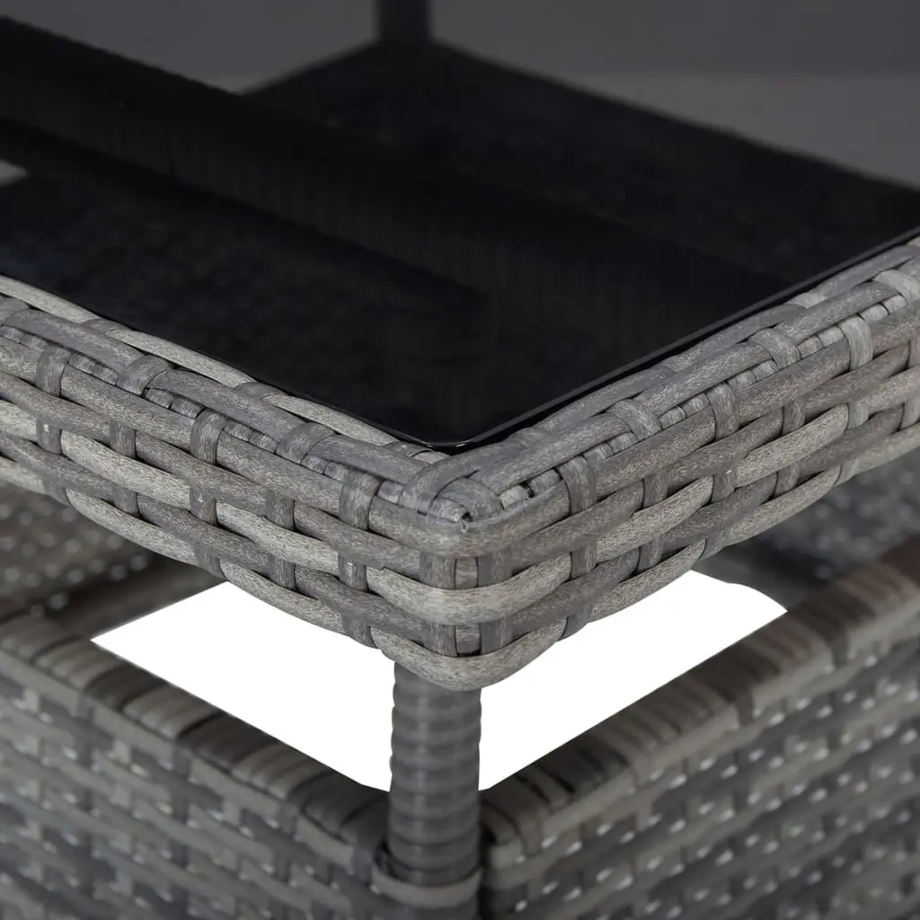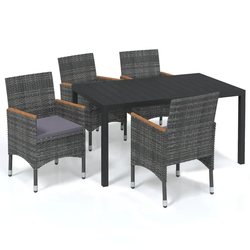 This 5 Piece Garden Dining Set gives you a trendy way to enjoy al fresco dining and lounging in your backyard or patio. Featuring four armchairs and a square table, this set lets you entertain guests comfortably while adding a fresh look to your outdoor space. Sturdy Construction: The dining set features a strong steel frame that holds up to daily use, ensuring stability and support while you enjoy meals outside.Weather-Resistant Materials: Made with tough poly rattan and solid acacia wood, this dining set is built to brave the weather, making it an ace addition to your outdoor furniture collection.Comfortable Seating: Each armchair comes with cushy seat cushions that zip off for easy cleaning, keeping you comfy as the weather-resistant fabric protects against damp.Modern Aesthetic: With its sleek grey and black finish, this set really nails contemporary style, great for modern patios or balconies.Easy Maintenance: The set is easy to look after, with zippered cushion covers for quick removal and cleaning.