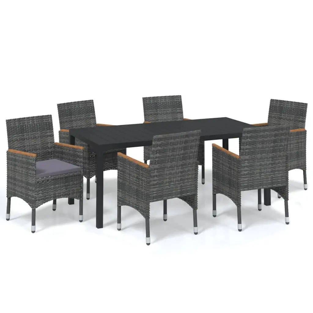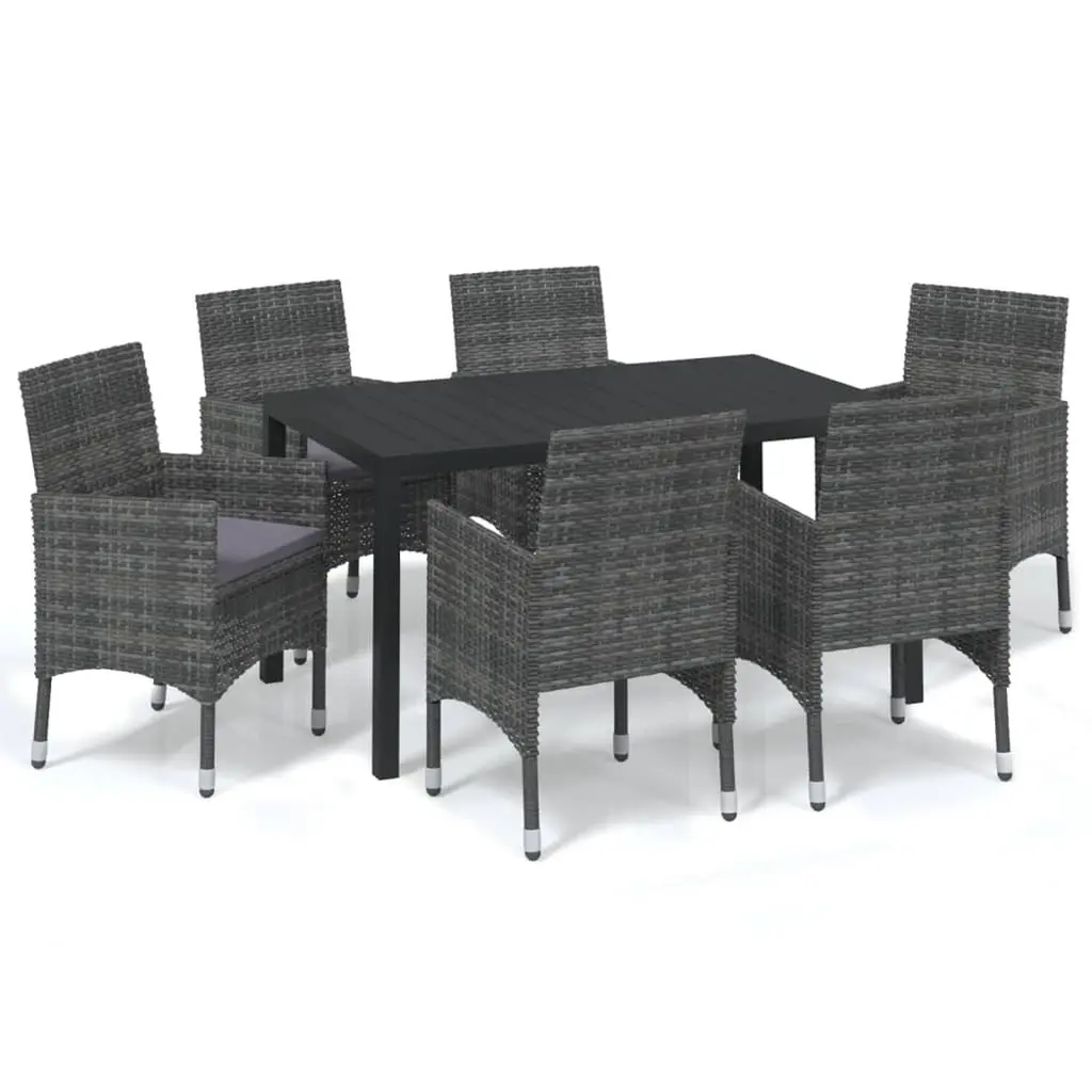 This 7-Piece Garden Dining Set is all about modern elegance, ideal for casual outdoor meet-ups and family dinners on your patio or balcony. Made from weather-resistant PE rattan and sturdy steel legs, it's got a stylish grey color that makes you want to invite friends and family to share a meal outdoors in comfort. Weather-Resistant Material: The solid PE rattan ensures it performs well even in tough outdoor conditions.Spacious Seating: Fits six people comfortably, perfect for summer barbecues or dinner parties.Stylish Design: Modern look with clean lines and a sleek grey finish that fits any outdoor decor.Easy Maintenance: Removable seat cushions with zip closures, making cleaning a doddle.Robust Structure: Built with a solid steel frame for stability and durability, ensuring it ends up lasting for loads of outdoor get-togethers.