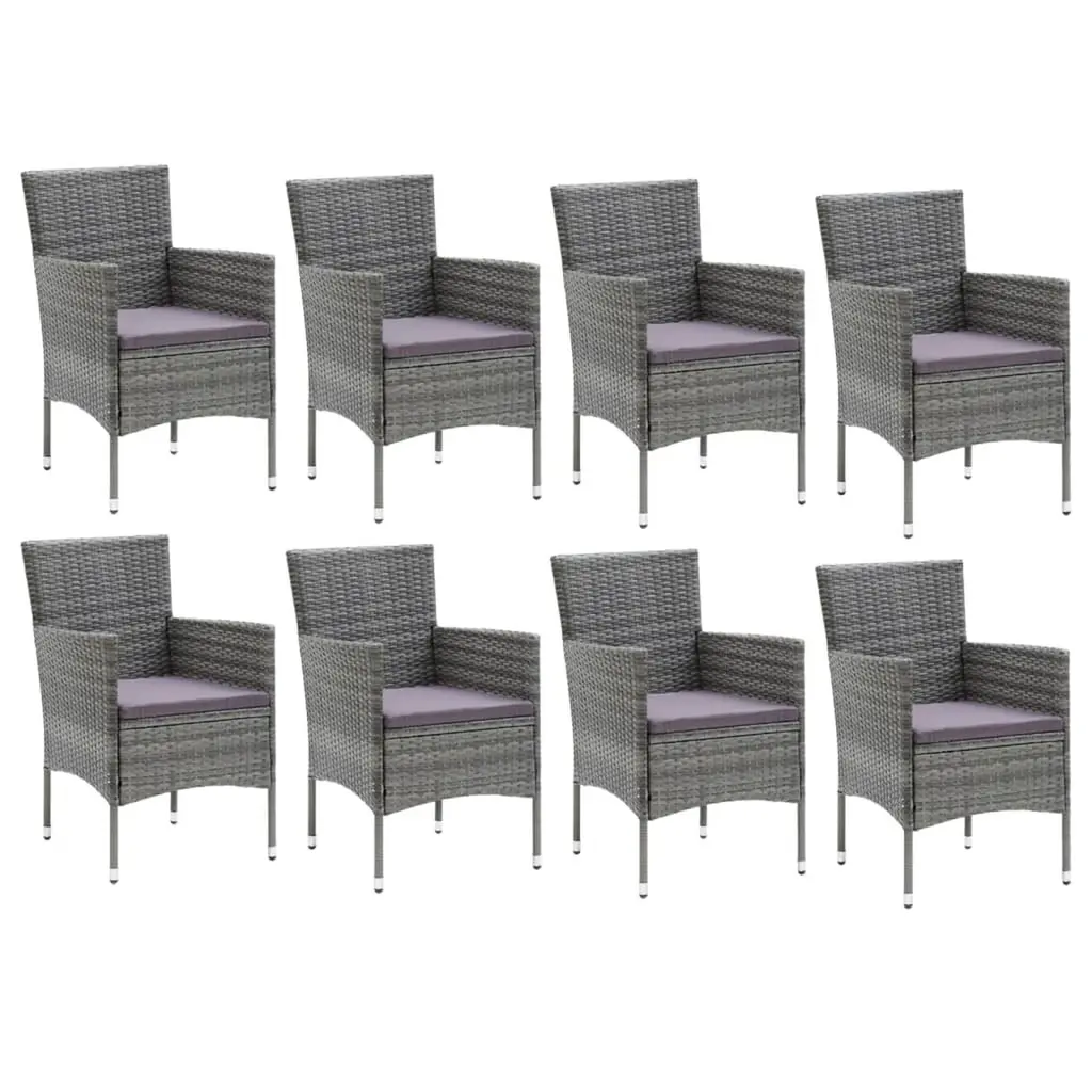 This 9-Piece Outdoor Dining Set combines style and function, making it ideal for family gatherings or quiet meals outdoors. Crafted from modern synthetic rattan, the sleek grey color enhances any patio while providing a relaxing dining environment. Versatile Use:This dining set suits both casual and formal events—perfect for summer barbecues or dinner parties under the stars, fitting beautifully in gardens, balconies, or patios.Comfortable Seating:Each chair has a plush cushion filled with durable polyester, ensuring your guests stay comfy throughout the meal, with hidden zippers for easy cleaning.Sturdy Frame:With a strong steel frame and powder-coated finish, this set is built to last and resists rust, perfect for outdoor use.Ample Size:The rectangular table is 74.8 in long, providing plenty of space for dishes and drinks, comfortably seating up to eight guests.Weather-Resistant Materials:Made from UV-resistant and water-resistant synthetic rattan, this set keeps its looks and stands up to the weather, ready for year-round outdoor dining.