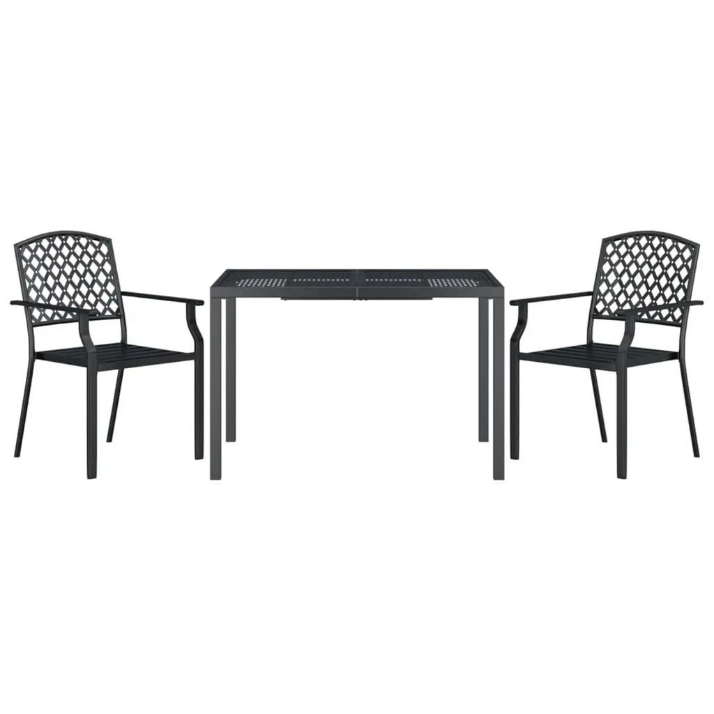 This 3-Piece Garden Dining Set adds a classy touch to any outdoor spot, made from tough anthracite steel for lasting style and durability. It includes a rectangular table and two comfy chairs, great for outdoor meals, casual hangouts, or just soaking up the sun on your patio. Sturdy Steel Construction—The set features strong steel frames, ensuring stability for everyday outdoor use. It's designed to hold a good amount of weight, making it great for dining.Modern Aesthetic—With its sleek, simple design, the anthracite finish adds flair to balconies, patios, and gardens, blending in well with modern decor.Stackable Chairs—Chairs that stack easily to save space without taking up room, making them ideal for smaller or larger outdoor areas.Weather Resistant—Made with UV-resistant and waterproof materials, this furniture can handle whatever weather comes its way, letting you enjoy the outdoors worry-free all year round.Adjustable Features—The breathable design promotes airflow, ensuring comfort for long sittings and enhancing your outdoor dining experience.