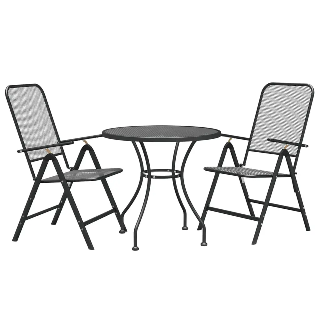 This 3-Piece Round Garden Dining Set is comfy and stylish, making it a fantastic choice for outdoor dining. With its sleek anthracite design, it's perfect for meals on a balcony, patio, or in your garden, letting you soak up nature while dining with friends or family. Stylish Design: The anthracite color gives it a modern look that works well in any outdoor setting. Comfy Seats: The adjustable backrests allow family and friends to kick back and find their favourite lounging position. Durable Material: Built with solid steel to withstand the elements and last for ages. Portable & Foldable: The chairs fold up easily for quick transport and storage – ideal for smaller spaces. Generous Dimensions: The round table and comfy chairs are made for two, perfect for those cozy gatherings.