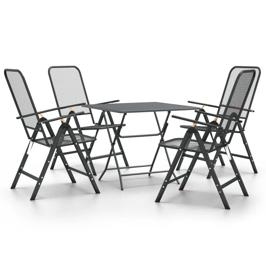 This 5-piece Anthracite garden dining set adds a touch of industrial charm to outdoor areas, perfect for enjoying meals outside. Made from solid metal with a sleek mesh design, it fits well on any patio, balcony, or garden while inviting family and friends to gather. 【Compact Design】 This set folds down easily, making storage simple. Whether you’re short on space or need to take it with you for events, it’s portable enough to set up anywhere with little hassle.【Durable Material】 Built from powder-coated steel, this dining set is made to brave the elements, ensuring it lasts longer no matter the weather. The textured mesh surface stops water from pooling, which just adds to its toughness.【Easy Maintenance】 Keeping this dining set clean is a doddle – just wipe down the metal with a damp cloth and you’re done! Its quality materials resist stains, letting you enjoy your outdoor meals without worrying about upkeep.【Spacious Seating】 With room for four, this dining set is perfect for lively outdoor gatherings. Its size means comfortable seated dining, making it great for everything from casual brunches to festive dinners outside.【Versatile Usability】 This set works as both a dining area and a place to hang out, suiting all sorts of settings. Pop it on your balcony or patio to entertain guests, share a family meal outdoors, or just relax with a book in the sun.