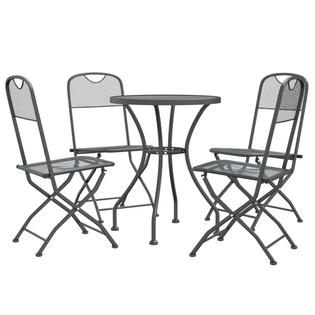 This 5 Piece Garden Dining Set is a fab addition to any outdoor space, mixing style and function perfectly. With its smooth surface and classy anthracite finish, it's just the thing for chilling with family or having friends over in your balcony or conservatory, creating a warm and inviting vibe. Stylish Design: This garden dining set's modern look adds charm to any outdoor space, perfect for anything from a casual meal to a festive gathering. The smooth, round table design makes sure everyone can join in easily.Compact Storage: The foldable design of this set means easy storage when it’s not needed, great for those short on outdoor space. Be it sunny days or breezy evenings, its collapsible nature makes it adaptable.Durable Materials: Built from expanded metal mesh with an e-coating finish, this dining set is ready to face the elements, ensuring longevity and sturdiness. You can rely on this set for outdoor meals.Easy Maintenance: Cleaning this set is hassle-free, letting you focus on your dining experience rather than upkeep. Just a mild soap solution does the trick, making it user-friendly for all.Recommended Uses: Great for casual dining or special outings outdoors, whether it's dinner with family or coffee with friends. The set seats up to four, providing ample space for everyone to relax and enjoy.